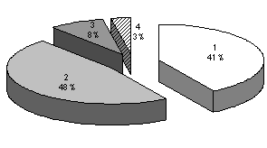 Рис 1. Оценка уровня получаемой в НГУ профессиональной подготовки: 1 - на уровне лучших мировых стандартов; 2 - ниже мировых стандартов, но один из лучших в России; 3 - обычный средний уровень, многие другие вузы дают подготовку не хуже; 4 - другое.