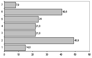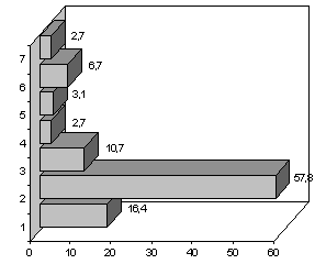 6. По уровню дохода студенты делятся на несколько неравнозначных групп. К модальной группе следует отнести лиц с доходом от 300 до 500 руб. в месяц - таковых треть среди всех респондентов. Значительна также группа с доходом менее 300 руб. (26%). Таким образом, более половины студентов живет в крайне стесненных материальных условиях. Другая группа студентов, живущих выше порога 500 руб., представлена: группа, имеющая доход от 500 до 700 руб. - 17% и от 700 до 1000 руб. - 15%. Остальных студентов (около 13%) можно отнести к группе с очень высоким доходом. Они имеют в месяц 1000-1500 руб. (4%), 1500-2000 руб. (2%), 2000-2500 руб. (2%), более 2500 руб. (3%).