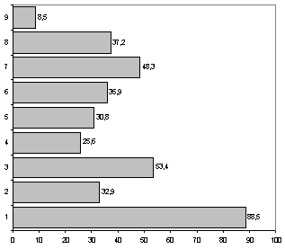 8. По мнению студентов, материальное положение родителей, так или иначе, оказывает влияние: на поступление в НГУ (68%); на успешность учебы (87%) и на возможность трудоустройства по окончании учебы (84%). В то же время это влияние, как отмечается, скорее слабое (естественное), чем существенное при поступлении и скорее существенное, чем слабое при учебе и трудоустройстве. Основное здесь то, что, согласно мнению более трети студентов, поступление в НГУ никак не зависит от материального положения родителей, а если и зависит, по мнению других, то зависимость эта все же не носит выраженного, тревожного характера, т.е. на входе в университет по-прежнему достаточно эффективно работает академический критерий отбора.