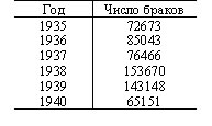 Население Сибири в исследуемые годы прошло через два “брачных” кризиса. Первый, в 1937 г., был обусловлен массовыми арестами граждан. Второй брачный кризис разразился в 1940 г. Количество зарегистрированных браков в этом году понизилось по отношению к 1939 г. более, чем в 2 раза. Статистики центра первоначально пытались игнорировать воздействие военного фактора, объясняя падение рождаемости ростом абортов и демографической волной 1914–1922 гг., поскольку сравнительно малочисленные поколения, родившиеся в период первой мировой и гражданской войн в конце 30-х гг. вступали в репродуктивный возраст. Это, в частности, специально подчеркивалось в аналитической записке