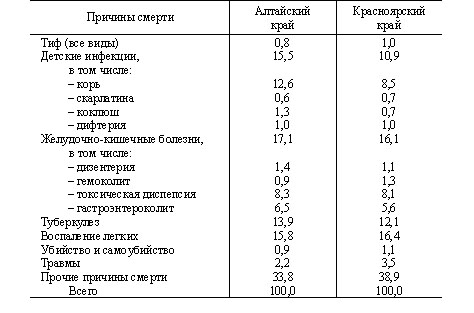 Данные табл. 3 свидетельствует о том, что люди умирали главным образом от болезней экзогенного происхождения, носивших выраженный социальный характер. Повышенная смертность от желудочно-кишечных заболеваний, острых инфекций, туберкулеза и воспаления легких была явным следствием недоедания, употребления в пищу недоброкачественных продуктов, проживания в тесных, перенаселенных, холодных и сырых помещениях, невозможности соблюдать требования санитарной гигиены, неразвитости коммунального хозяйства городов. Многочисленные смерти от травм свидетельствуют о слабости служб, отвечающих за безопасность труда, большое количество убийств и самоубийств отражали общую дискомфортность жизни в условиях тоталитаризма.