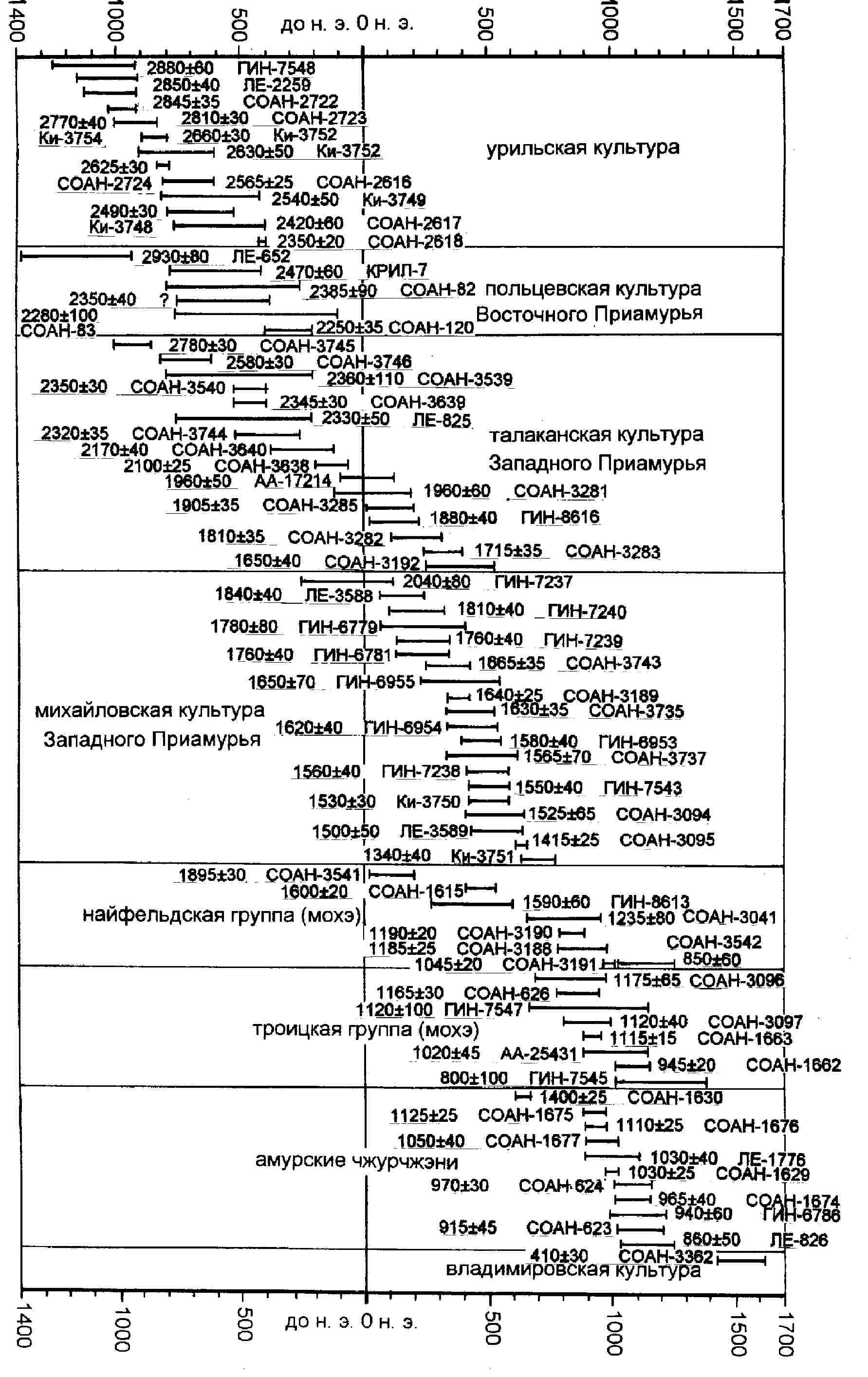 17 соответствует календарной дате 1430–1620 гг. н. э. и ограничивает сверху последовательность средневековых культур региона.Cреди проанализированных, но не включенных в схему дат имеются такие, которые нельзя отнести с определенностью к какой-либо известной культуре. Так, дата 1425±50 л. н. (СОАН–3286; 540–676 гг. н. э.), полученная по углю из кострища памятника Сухие Протоки–2 на р. Бурее, вполне может быть отнесена к михайловской культуре, так как ее керамика на данном памятнике присутствует. Однако это кострище не связано с жилищем, и поэтому само по себе не идентифицируется с материалами михайловской культуры. Другая дата получена для жилища 3 памятника Усть-Талакан (1175±30 л. н., СОАН–3284; 778–949 гг. н. э.) и сопоставима с хронологией найфельдской и троицкой групп мохэской культуры, но отличается от них лепной керамикой (бурейская группа).