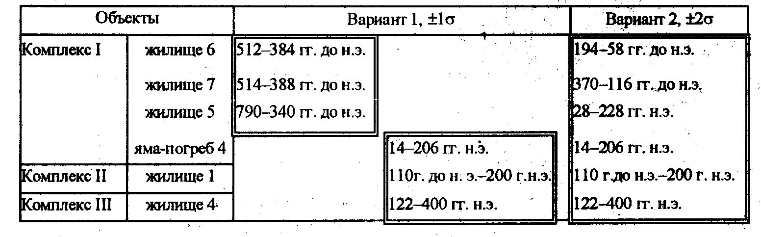 Образец обугленной бересты СОАН–3281 взят из-под очага жилища 1, то есть данный образец можно рассматривать как наиболее чистый, а полученную по нему дату конец II в. до н. э. – II в. н. э. – как наиболее достоверную для жилища 1.