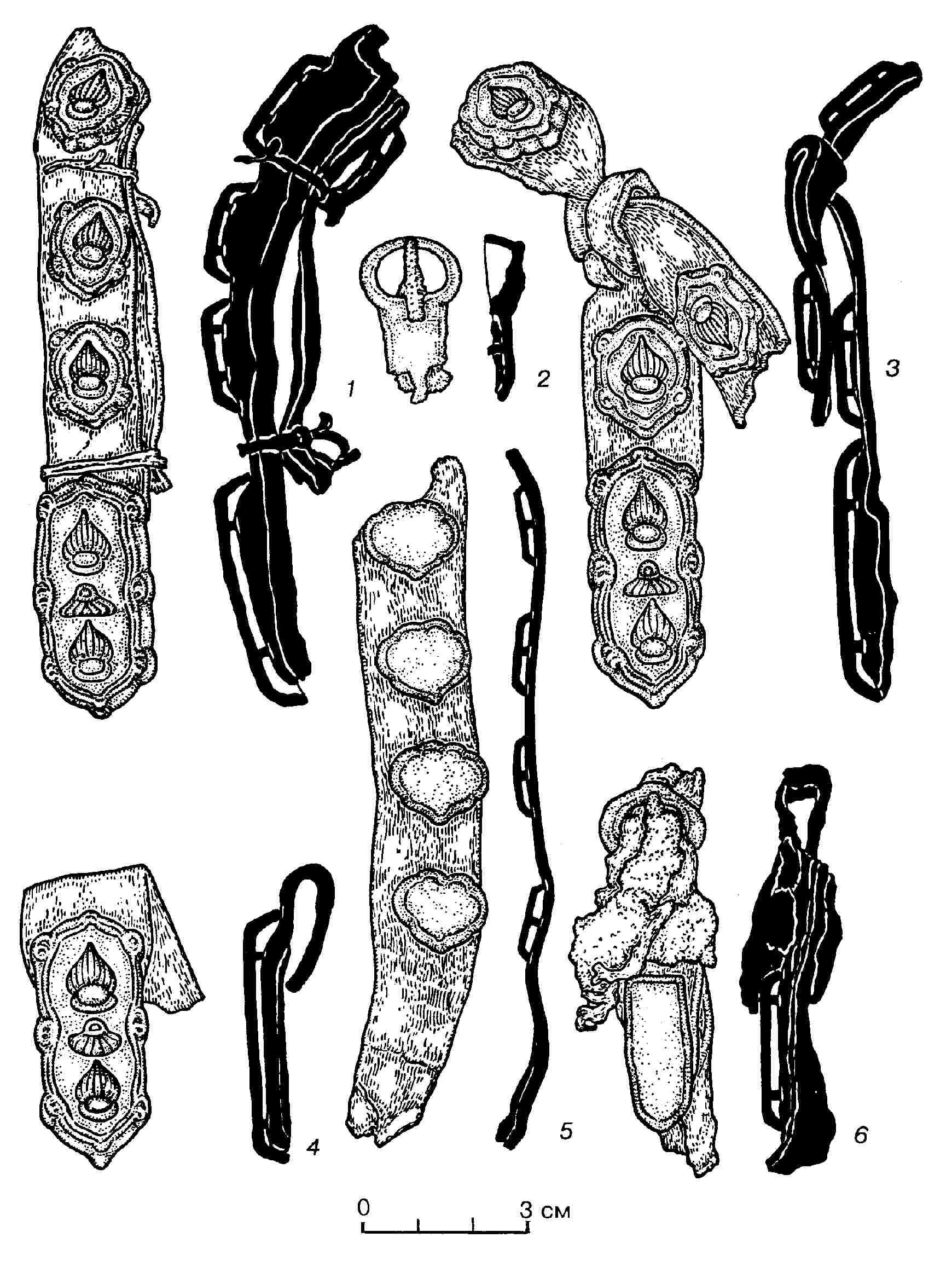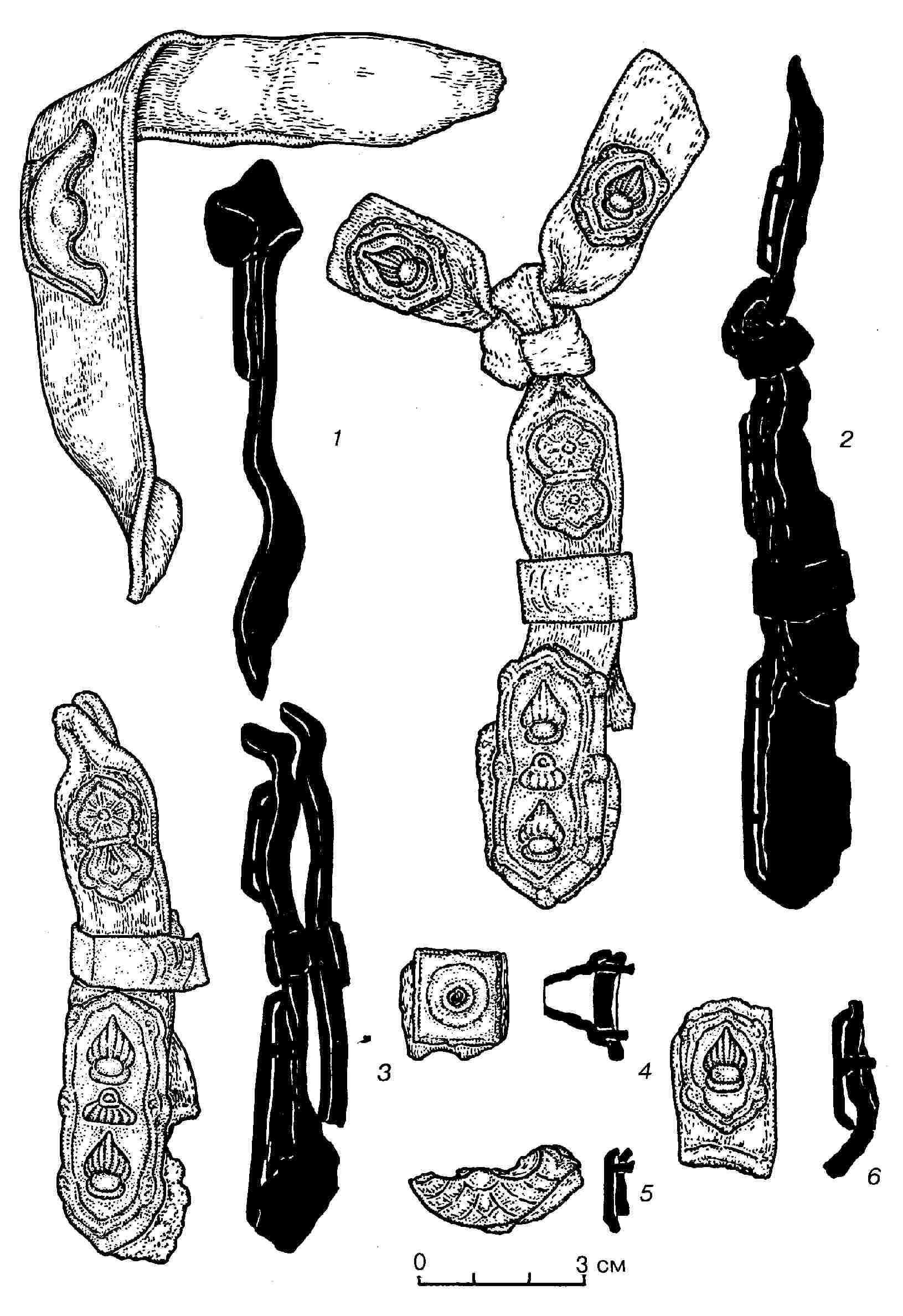 3, 4). Из-за сильной фрагментарности конструкция этих ремней в точности не восстанавливается, в составе колчанной портупеи присутствовали пряжки с гладким щитком, сердцевидные и прямоугольные бляшки с округлым концом без орнамента (см. рис. 3, I, 4, 5; 4, 2, 5, 6).Уздечные и седельные накладки и бляшки с каноническим орнаментом изготовлены из бронзы, но были покрыты позолотой и выглядели очень нарядно, свидетельствуя о достаточно высоком социальном статусе погребенного древнетюркского воина