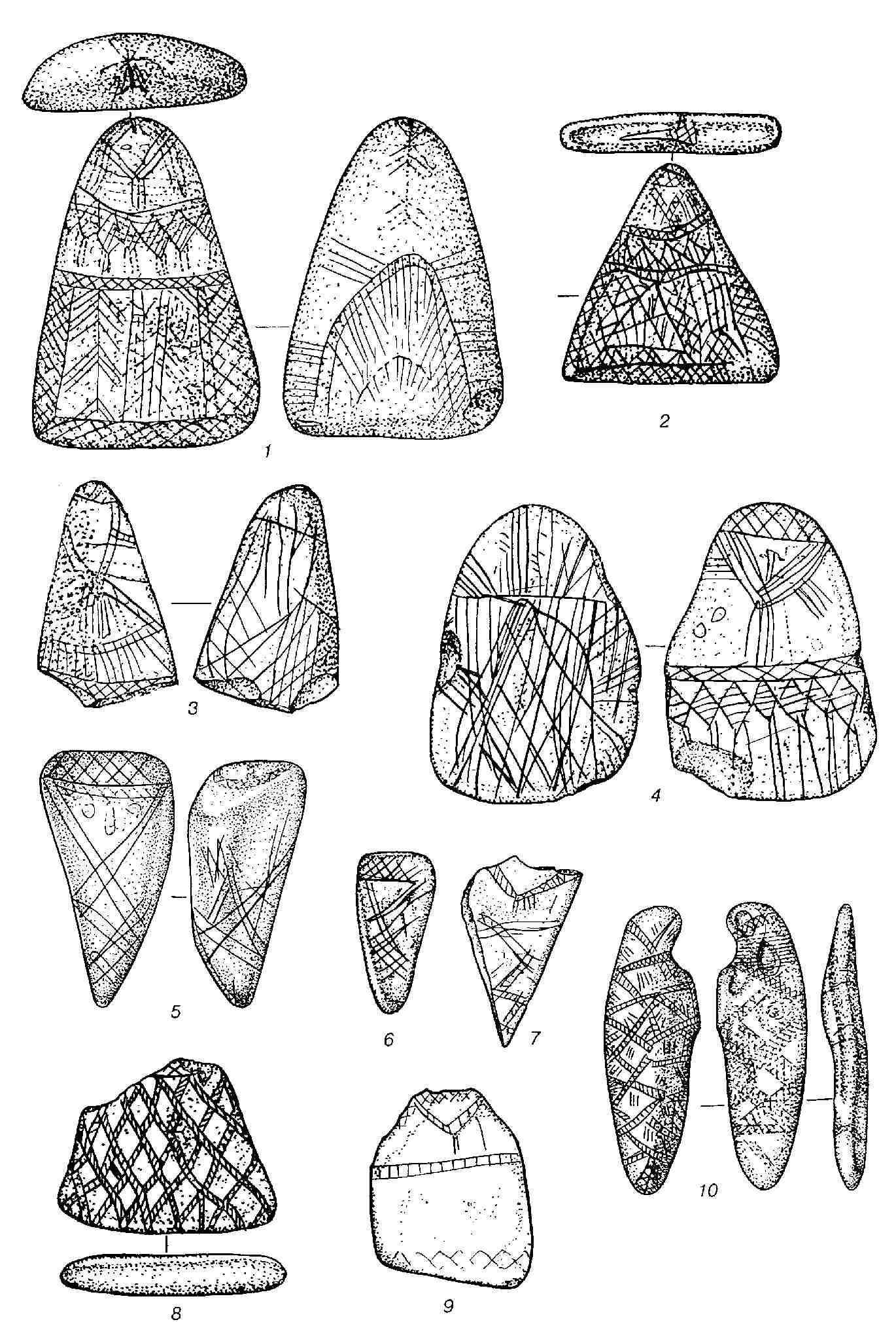 Гравировальные гальки с поселения Торгажак.Своеобразный орнамент в виде парных пунктирных линий, точечный или треугольно-зубчатый узор наносились на кисти рук и предплечья (см. рис. 1,