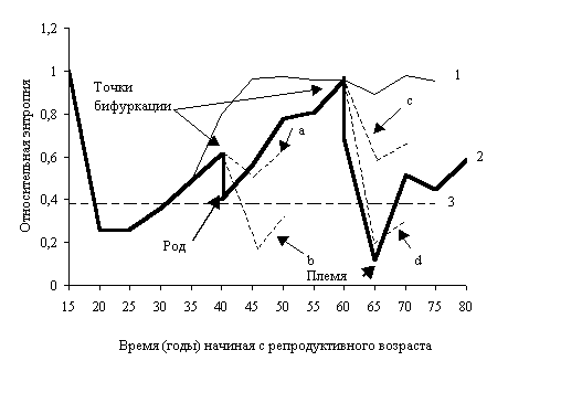 Динамика относительной энтропии социума с образованием рода и племени на основе