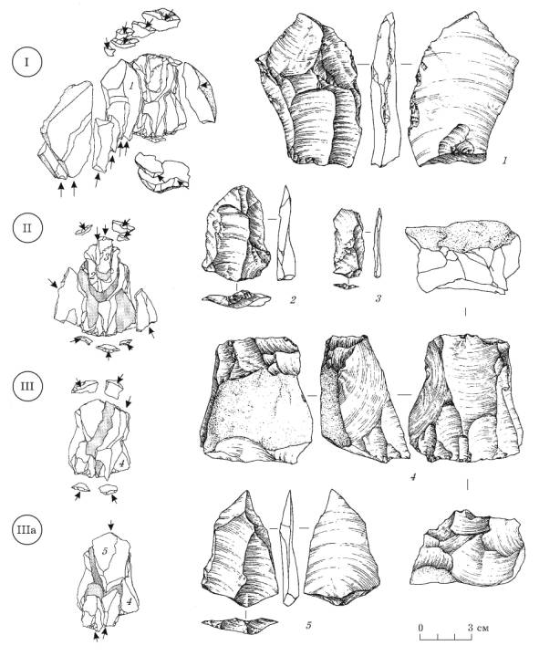 I – декортикация и формирование нуклеуса; II, III, IIIa – рекуррентные серии снятий (II – серия снятий для получения первого треугольного скола; III, IIIа – серия снятий для получения второго треугольного скола).