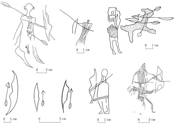 разновременных сюжетов наскального искусства. Охотники, вооруженные луками,