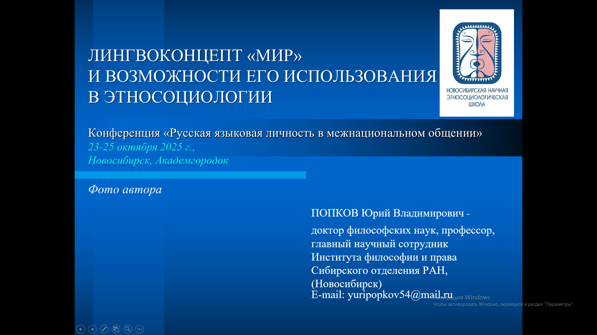 23 октября 2025 года г.н.с. ИФПР СО РАН, профессор Ю.В. Попков открыл дискуссию на пленарном заседании начавшей свою работу Всероссийской конференции с международным участием «Русская языковая личность в межнациональном общении». Он выступил с докладом «Лингвоконцепт «мир» и возможности его использования в этносоциологии», акцентировав многозначность и глубинное сходство интерпретаций лексемы «мир», опасности соблазнов расширительной трактовки концепта «русский мир». Основное внимание Юрий Владимирович посвятил освещению результатов проведенных с коллегами этносоциальных исследований с использованием лингвоконцептов «евразийский мир», «монгольских мир», «сельский мир» и др.