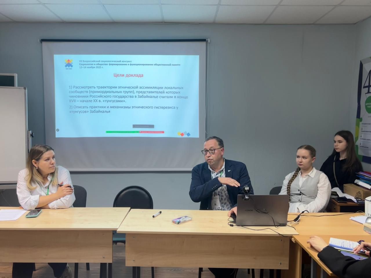 В докладе Николая Ивановича Карбаинова, н.с. сектора истории российской социологии Социологического института РАН – филиала ФНИСЦ РАН (г. СанктПетербург) «Тунгусы Забайкалья: траектории этнической ассимиляции в XIX – первой четверти XXI вв.» внимание было сфокусировано на потребности интеграции примордиалистской и конструктивистской позиций при рассмотрении феномена этничности (фото 3).