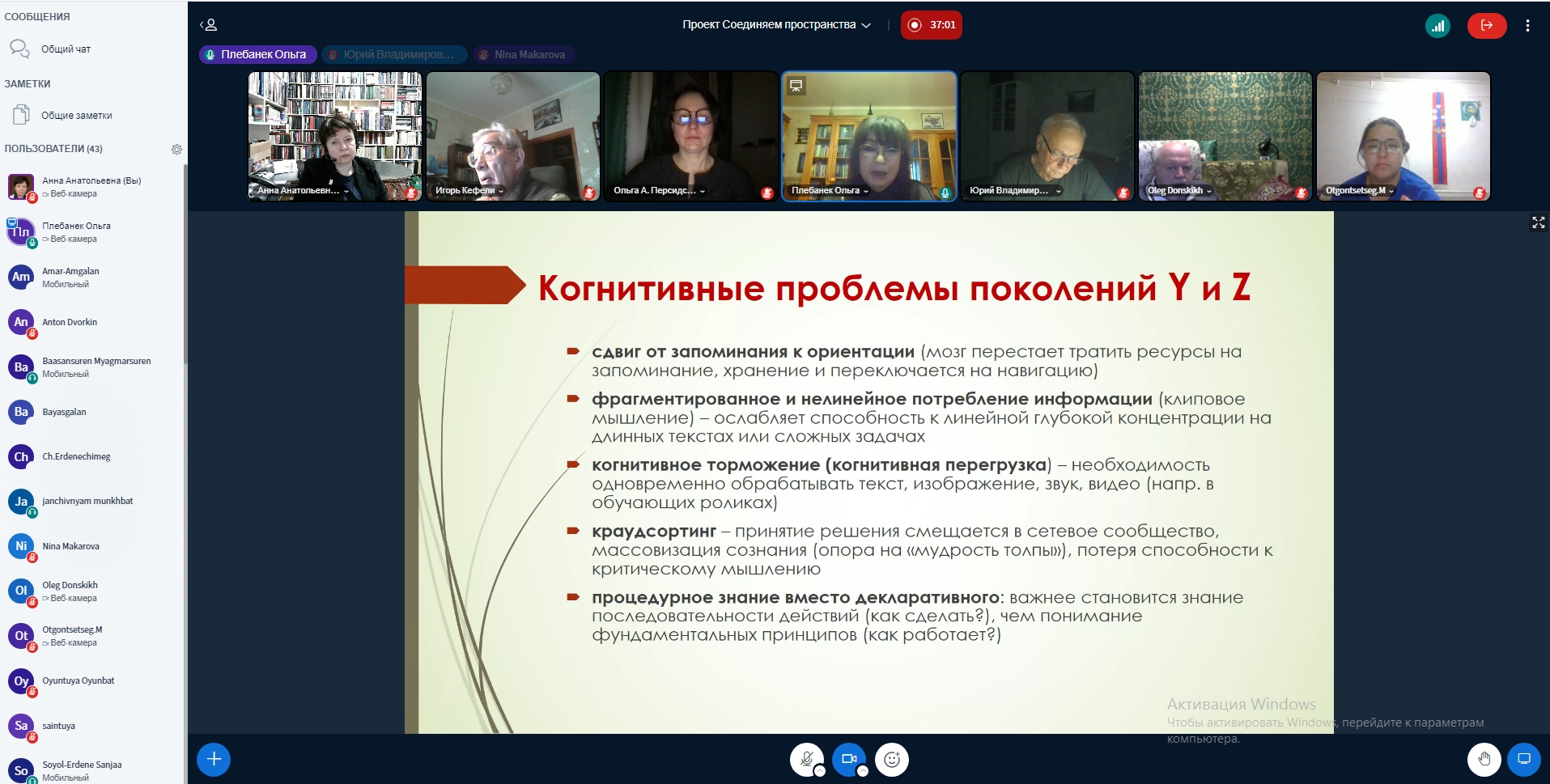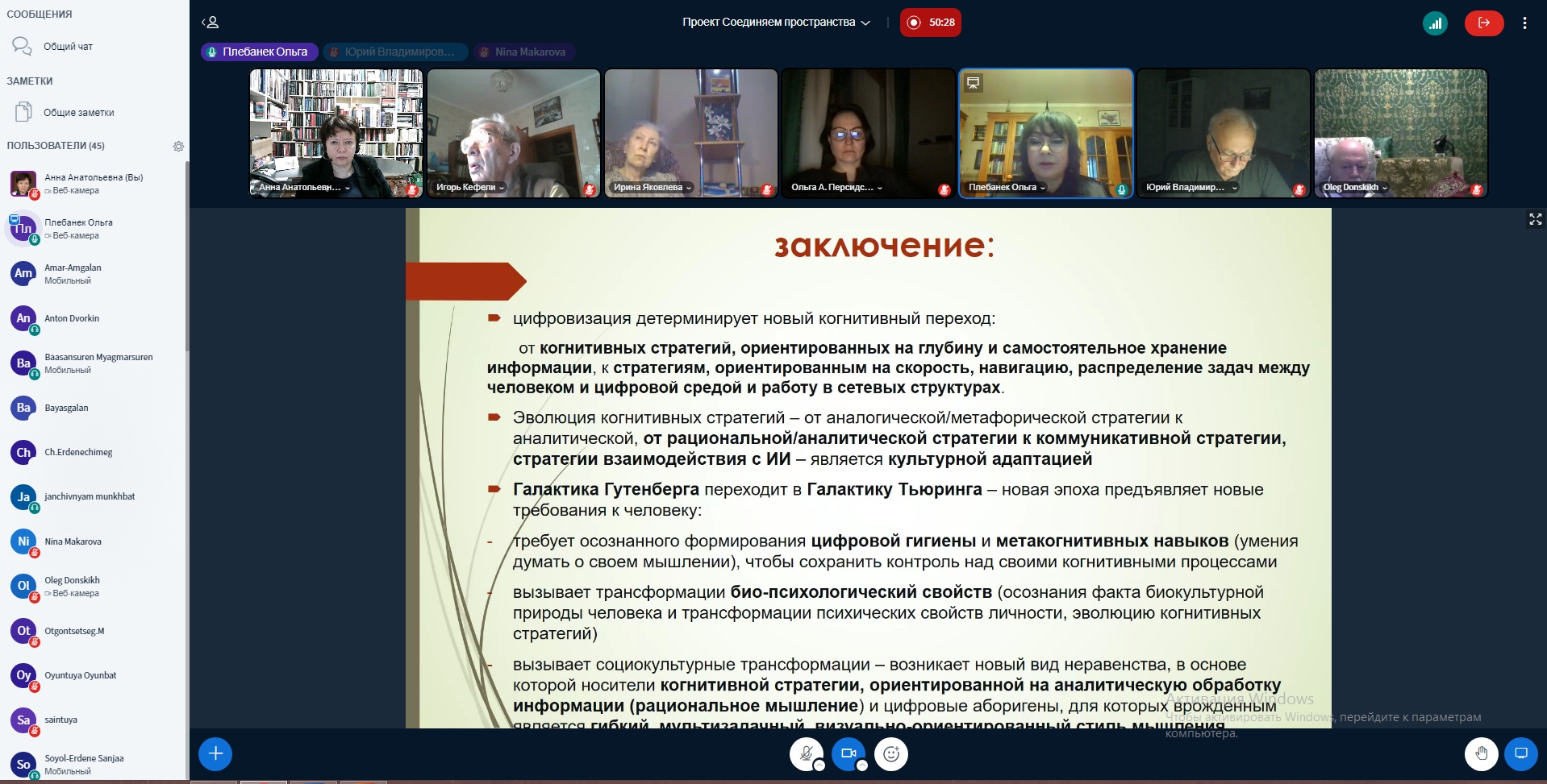 28 марта состоялось XXX заседание Всероссийского с международным участием научного вебинара по проблемам социальных и гуманитарных наук «Соединяем пространства». Вебинар был подготовлен совместно с кафедрой социально-гуманитарных дисциплин Университета при Межпарламентской Ассамблее Евразийского экономического сообщества (МПА ЕврАзЭС) (г. Санкт-Петербург). В работе приняли участие 39 исследователей из разных городов России (Абакан, Иркутск, Курган, Купино, Москва, Мурманск, Новосибирск, Санкт-Петербург, Томск), Казахстана (Алматы) и Монголии (Улан-Батор, Булган, Баянхонгор, Хэнтий, Баян-Ульги).