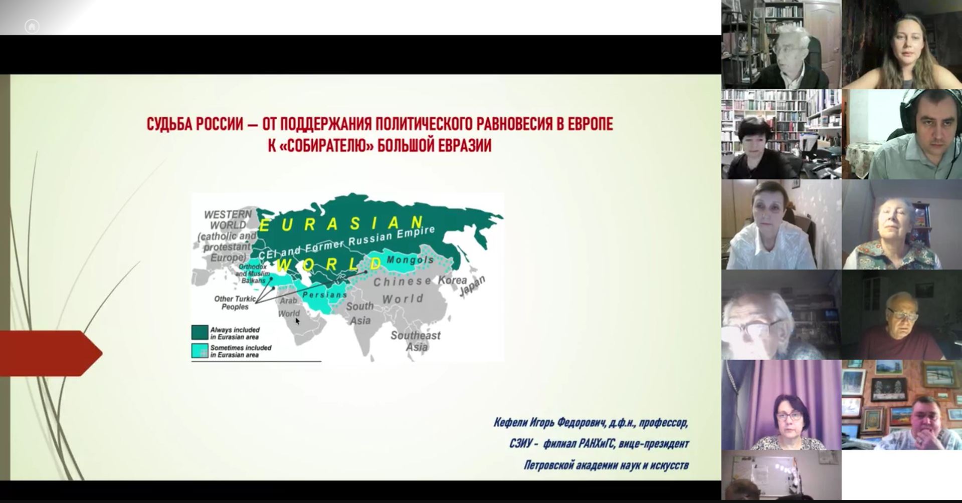 Помимо доклада И.Ф. Кефели провел презентацию книги «Личность. Жизнь. Евразийство. Эпистолярное наследие П.Н. Савицкого – 1916–1968 гг. К 130-летию со дня рождения теоретика евразийства и евразийской геополитики / Научн. ред. И.Ф. Кефели. Составление, подготовка текста, вступительная статья, комментарии К.Е. Ермишиной, комментарии раздела «Письма П.Н. Савицкого Л.Н. Гумилеву» К.Б. Ермишиной, Р. Р. Вахитова. – СПб. : Издательский дом «ПЕТРОПОЛИС», 2026. – 862 с.». И.Ф. Кефели рассказал об истории публикации писем П.Н. Савицкого, о существовании большого количества еще неопубликованных материалов наследия великого русского философа. Часть писем, написанных П.Н. Савицким Л.Н. Гумилеву и хранившихся в собрании Музея-квартиры Л. Н. Гумилева в Санкт-Петербурге, была опубликована И.Ф. Кефели еще в 2008 г. на страницах журнала «Геополитика и безопасность», главным редактором которого он в тот период был. В книге «Личность. Жизнь. Евразийство. Эпистолярное наследие П.Н. Савицкого» опубликованы письма к П. П. Сувчинскому, Н. Н. Алексееву, П. Б. Струве, Л. Н. Гумилеву, Г. В. Вернадскому, свт. Афанасию (Сахарову) и другим известным русским мыслителям. И.Ф. Кефели подчеркнул уникальность вышедшей книги, она заключается в том, что по мере ее прочтения можно погружаться во внутреннюю творческую лабораторию П.Н. Савицкого, понимать, как появлялись понятия и концепты евразийства. Один экземпляр книги И.Ф. Кефели переслал в библиотеку ИФПР СО РАН. Для получения бумажного варианта книги в личную библиотеку необходимо ее заказать, связавшись с Издательским домом «ПЕТРОПОЛИС». Более подробно узнать о возможности получения книги «Личность. Жизнь. Евразийство. Эпистолярное наследие П.Н. Савицкого» можно у модераторов вебинара «Соединяем пространства».