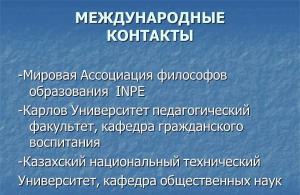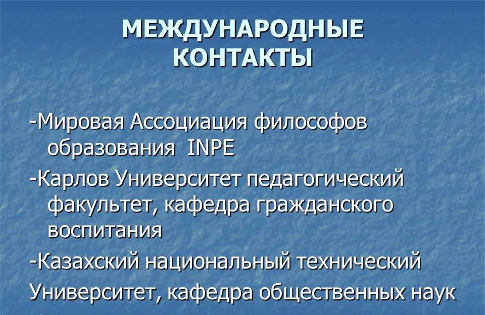 - с Казахским Национальном Техническим университетом (по изучению современных тенденций развития философии образования Востока и Запада - аксиологические аспекты);