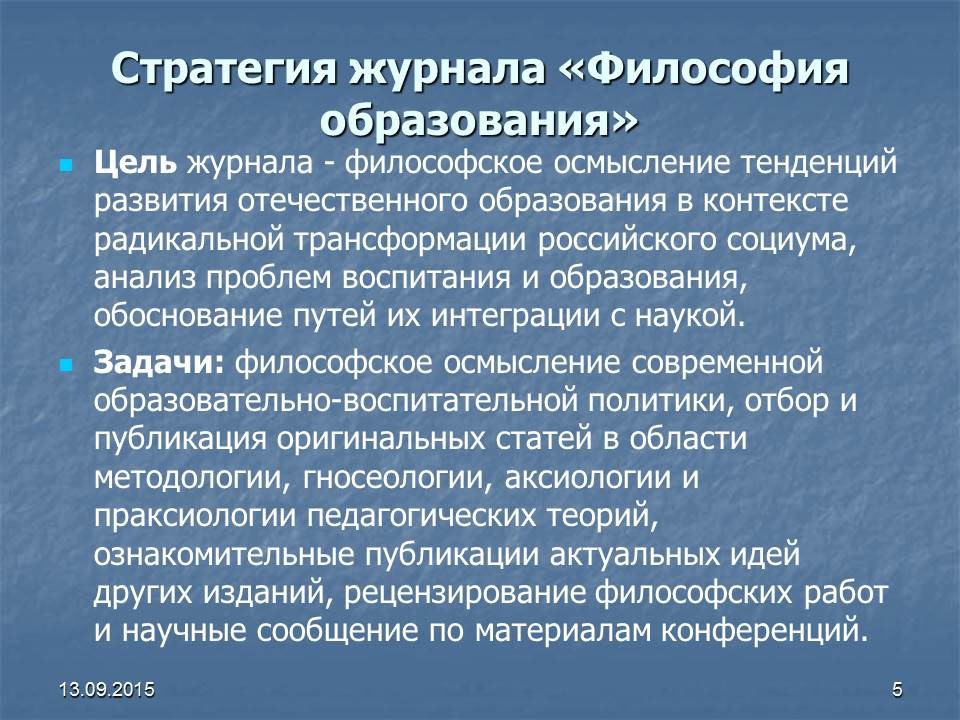 Журнал включен в "Перечень ведущих рецензируемых научных журналов и изданий, в которых должны быть опубликованы основные научные результаты диссертации на соискание ученой степени доктора и кандидата наук". Он рекомендован экспертным советам по философии и по педагогике. Индекс в общероссийском каталоге - 82326. На страницах журнала предлагается анализ актуальных проблем развития общества и образования, обеспечения культуры и качества образования, правовой, социальной защищенности участников процесса образования и др. Важнейший принцип деятельности журнала – освещение как традиционных проблем теории и философии образования, так и вопросов экономики, политологии, психологии, педагогики, специфики современной образовательной политики.