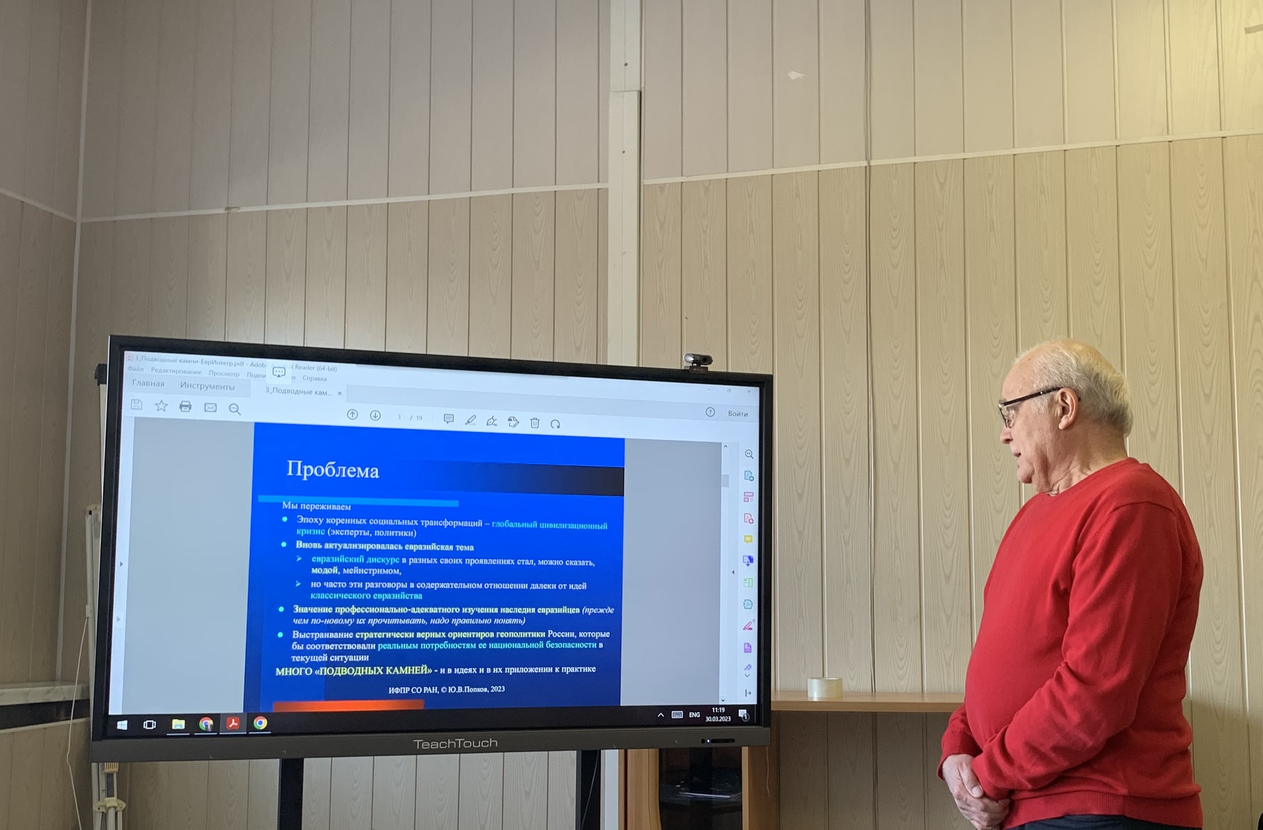 В рамках пленарного заседания, прошедшего под председательством старшего научного сотрудника ИФПР СО РАН к. филос.н., доцента Петрова Владимира Валерьевича, участники обсудили ряд социогуманитарных аспектов современного этапа развития человеческой цивилизации. Главный научный сотрудник ИФПР СО РАН, д. филос.н., профессор Попков Юрий Владимирович в своем докладе ««Подводные камни» и детерминанты современной евразийской интеграции: от идеи – к практике» обосновал важную роль экономического, политического и социального обустройства России, внутриевразийских и трансевразийских взаимодействий для успешного осуществления евразийской интеграции, актуализировал значимость наследия представителей классического евразийства и предложил в качестве детерминанты данного процесса рассматривать необходимость переформатирования внутренней и геополитики России.
