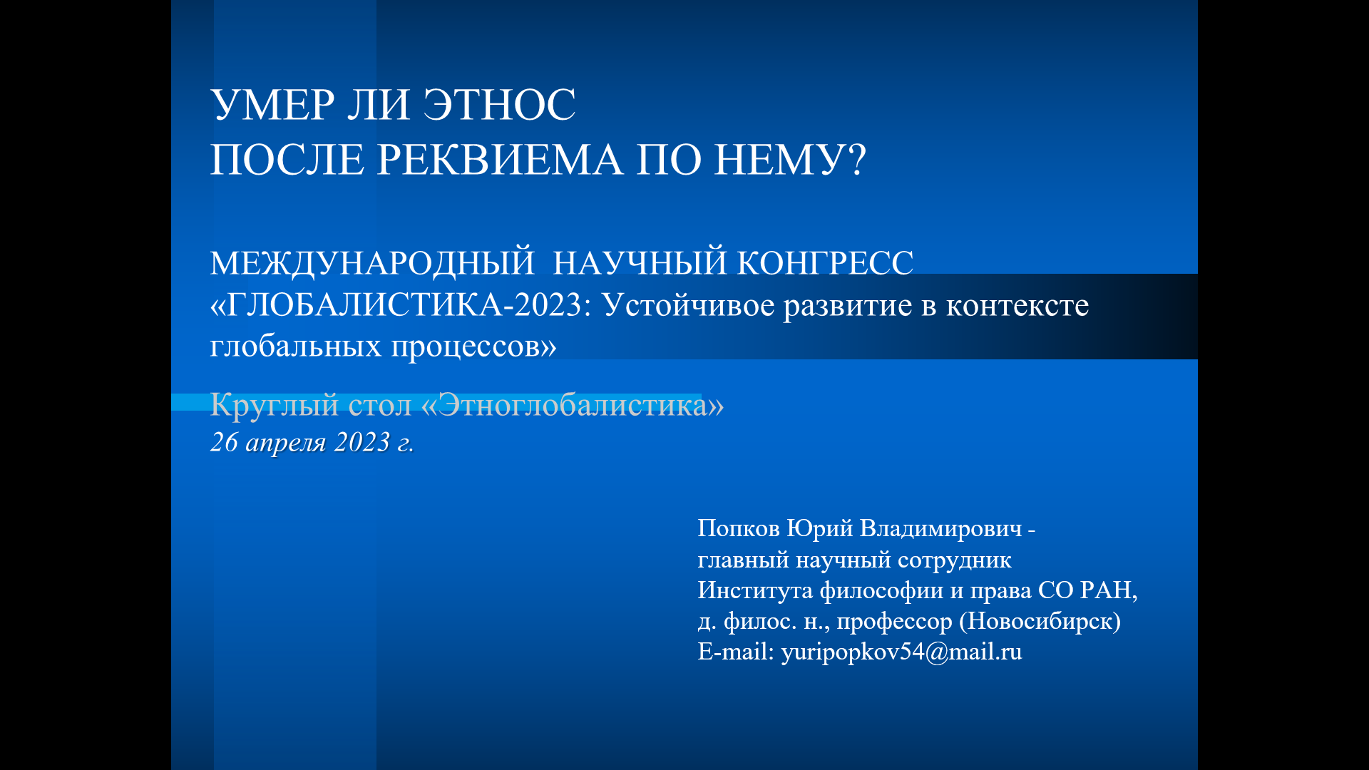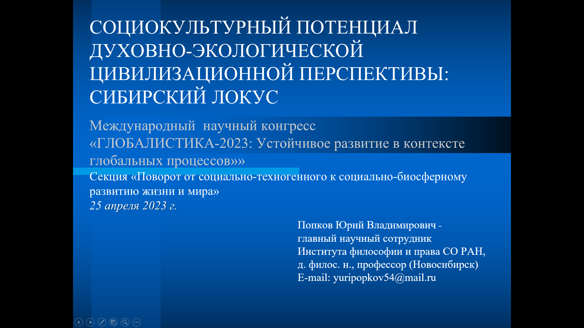 Главный научный сотрудник ИФПР СО РАН, профессор Ю. В. Попков принял участие в весенней сессии VII Международного научного конгресса «Глобалистика-2023: Устойчивое развитие в контексте глобальных процессов», посвященного 160-летию со дня рождения В.И. Вернадского. Конгресс включает обширную многодневную программу мероприятий (https://www.globalistika.ru/congress2023) и проходит на базе Московского государственного университета имени М.В. Ломоносова, который традиционно организует и принимает конгрессы «Глобалистика» с 2009 года.