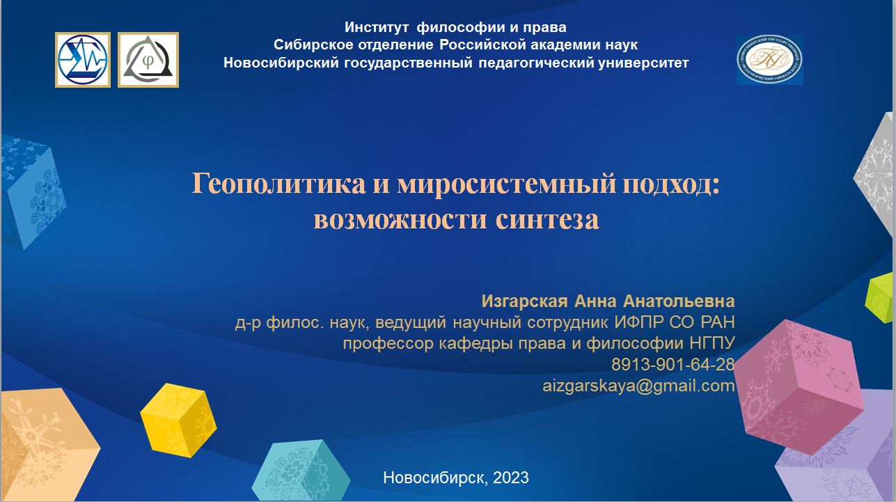 С докладом «Геополитика и миросистемный подход: возможности синтеза» выступила ведущий научный сотрудник отдела социальных и правовых исследований ИФПР СО РАН, д-р филос. наук Анна Анатольевна Изгарская. В докладе были раскрыты преимущества теории геополитической динамики Р. Коллинза и миросистемного подхода посредством их сравнения с концепциями конкурирующих парадигм. А.А. Изгарская описала основания синтеза и представила несколько общих теоретических моделей, позволяющих объяснять динамику современных обществ с учетом их геополитико-миросистемного многообразия. В заключительной части доклада А.А. Изгарская обозначила ряд факторов территориальной динамики государств современной миросистемы и на этой основе сделала краткую интерпретацию текущей ситуации в России.