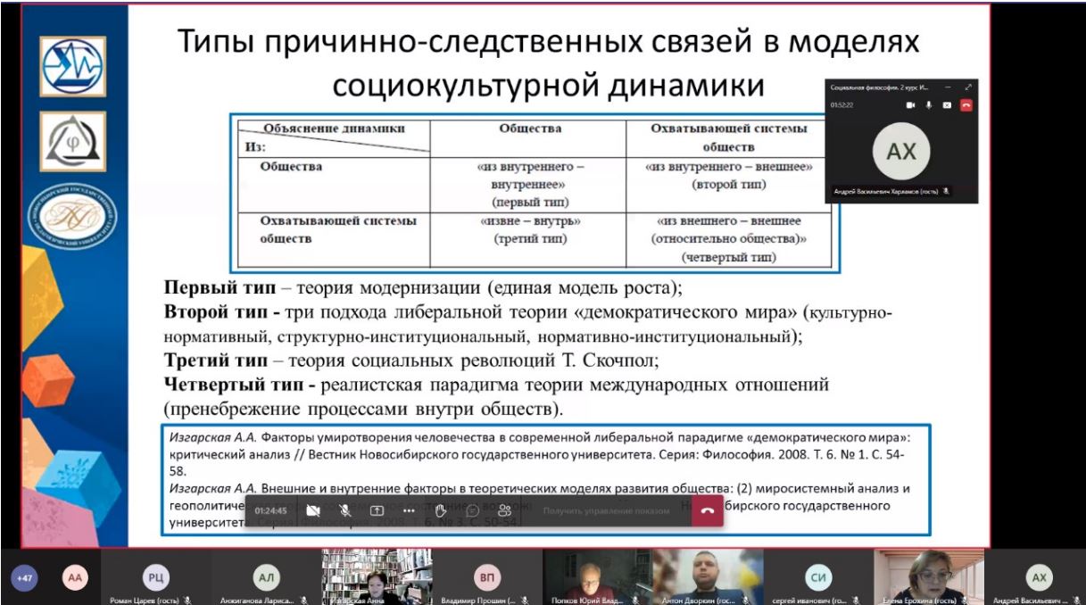 25 ноября 2023 г. в 16.00 по московскому времени состоялось X заседание Всероссийского научного вебинара по проблемам социальных и гуманитарных наук «Соединяем пространства» с международным участием. Вебинар был подготовлен совместно с кафедрой права и философии Новосибирского государственного педагогического университета (НГПУ). Вебинар объединил 31 исследователя из России (Абакан, Красноярск, Курган, Москва, Новосибирск, Омск, Санкт-Петербург), Казахстана (Алматы), Монголии (Улан-Батор). В качестве слушателей были приглашены студенты Института истории, гуманитарного и социального образования НГПУ (22 человека). Участники вебинара заслушали два доклада.