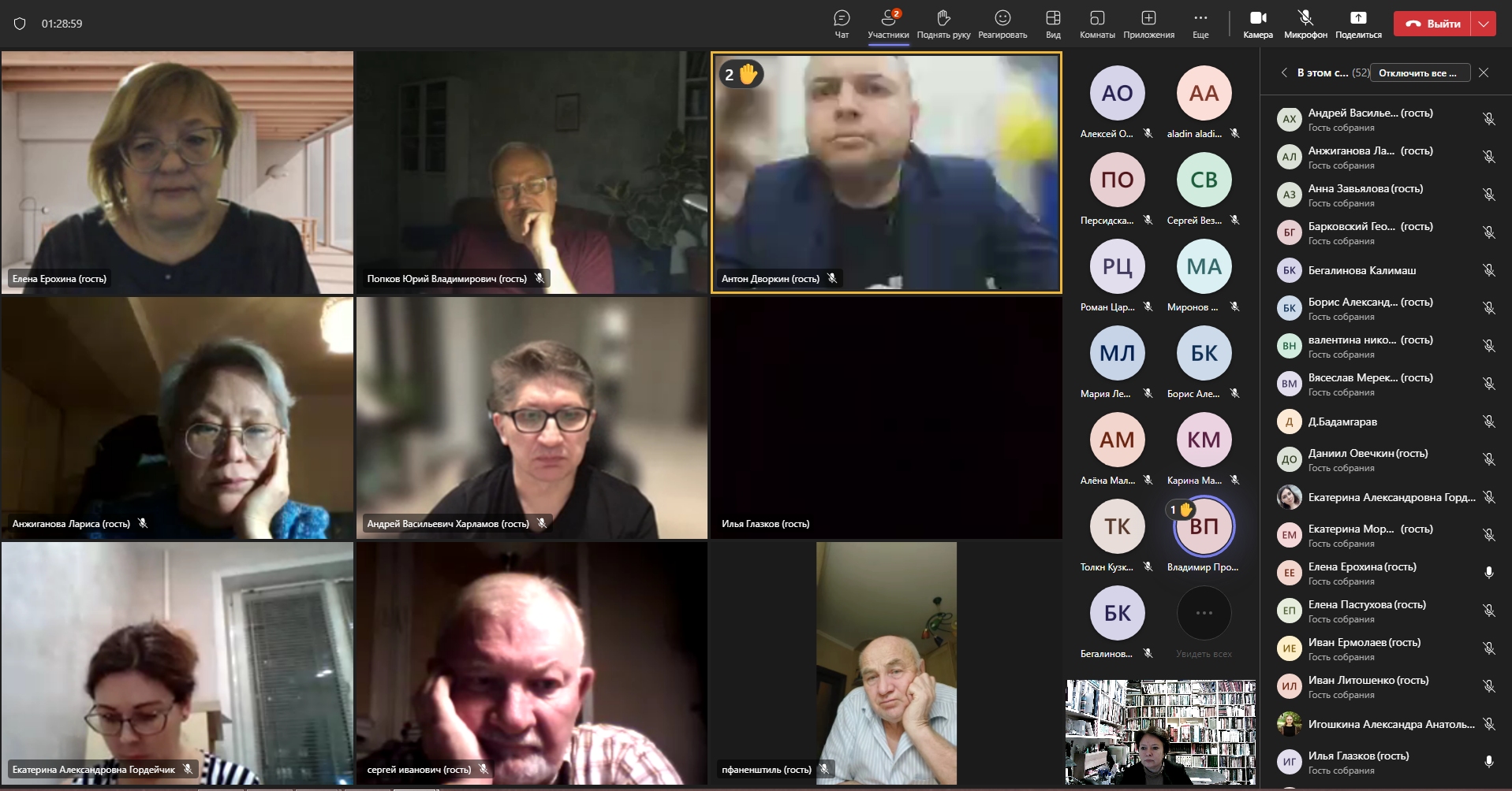 Активное участие в работе вебинара и обсуждении докладов приняли д-р филос. наук, профессор Л.В. Анжиганова, д-р филос. наук, профессор К.К. Бегалинова, канд. филол. наук С.И. Везнер, аспирант А.Б. Дворкин, д-р филос. наук, доцент Е.А. Ерохина, канд. филос. наук В.А. Миронов, д-р филос. наук, профессор Ю.В. Попков, канд. истор. наук, доцент В.А. Прошин, д-р филос. наук, профессор И.А. Пфаненштиль, канд. филос. наук, доцент А.В. Харламов, канд. филол. наук Л.А. Ульяницкая, канд. филос. наук, доцент С.И. Филиппов, канд. филос. наук, доцент Р.Ю. Царёв, д-р филос. наук А.А. Изгарская.