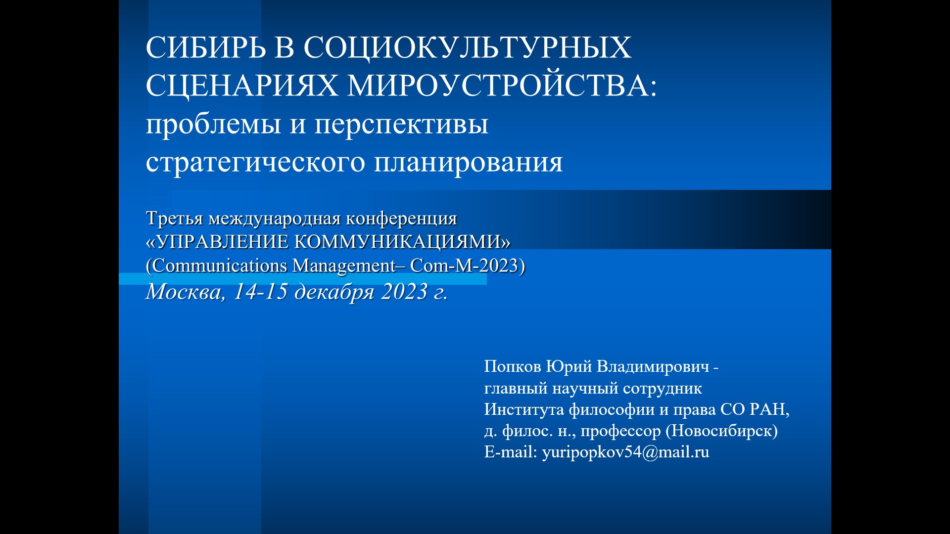 14-15 декабря 2023 года г.н.м. ИФПР СО РАН, профессор Ю.В. Попков принял участие в работе III Международной научно-практической конференции «Управление коммуникациями», которая прошла на базе Московского государствнного лингвистического университета. Юрий Владимирович сделал доклад на тему «Сибирь в социокультурных сценариях мироустройства: проблемы и перспективы стратегического планирования». Отталкиваясь от принятого на государственном уровне официального определения России как государства-цивилизации он акцентировал вопрос о ее цивилизационной перспективе, непосредственно связывая эту перспективу с особой ролью Сибири и необходимостью ее «опережающего» развития. Исходной точкой такой установки является тот факт, что Россия стала державой и собственно цивилизацией именно благодаря присоединению и освоению Сибири. В этой связи и с учетом нового поворот России на Восток принципиально важной является задача по разработке и реализации специальной комплексной государственной программы развития Сибири.