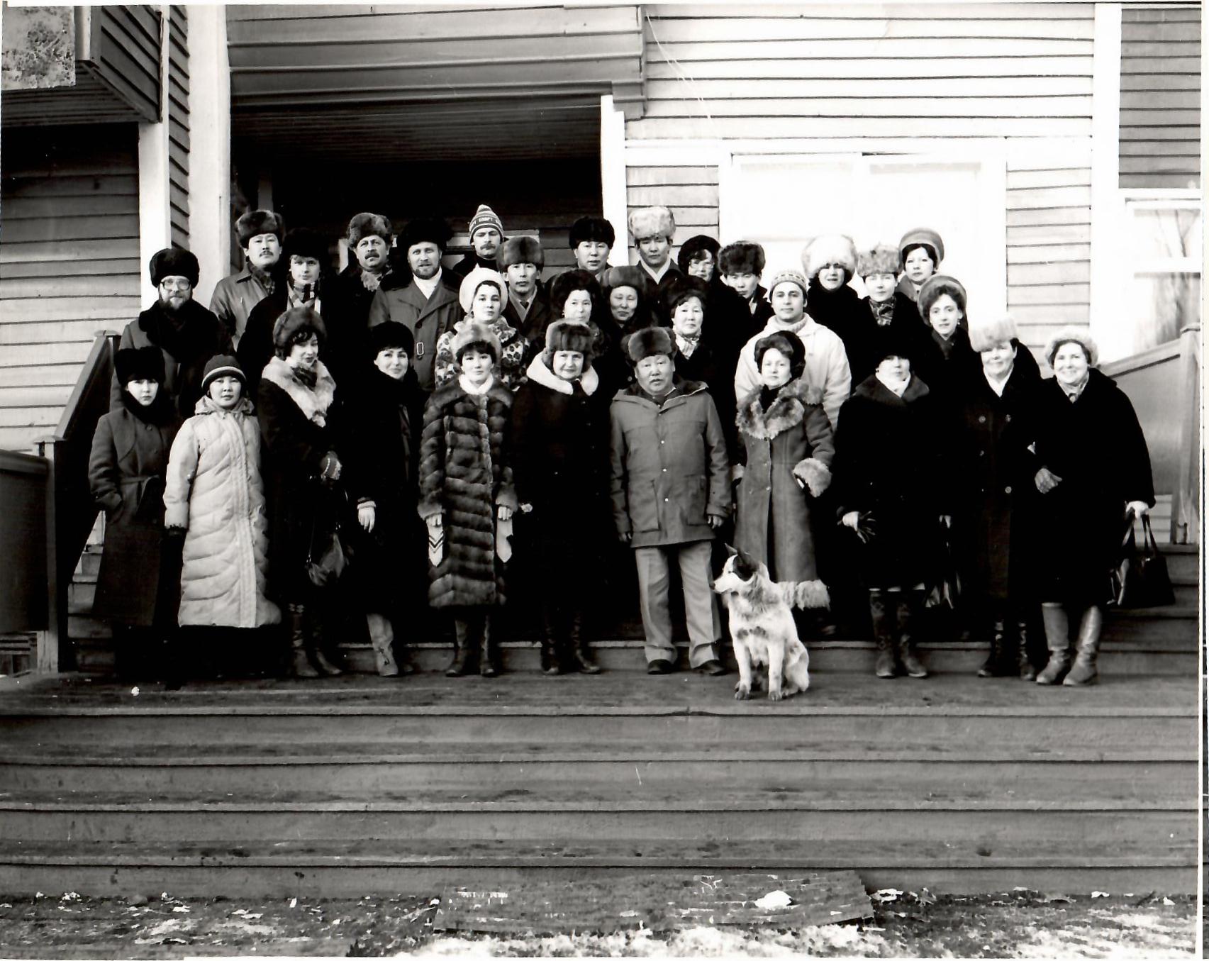 Участники Комплексной экспедиции на крыльце Правления совхоза Томпонский. В центре – директор совхоза Василий Михайлович Кладкин. Крайняя справа в первом ряду – канд. филос. наук Магна Марковна Траскунова. В верхнем ряду слева от центра – канд. биол. наук Юрий Михайлович Плюснин, канд. филос. наук Юрий Влалимирович Попков, Владимир Семенович Золототрубов