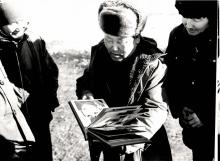 Кладкин Василий Михайлович рассматривает фотоальбом, подготовленный сотрудниками ИИФиФ СО АН СССР (зима 1987 г., из полевых архивов Томпонского эксперимента)