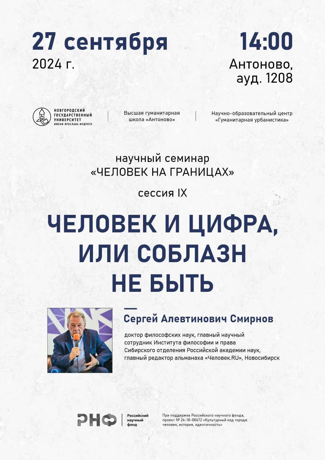 Г.н.с. ИФПР С.А.Смирнов выступил с открытой лекций в Новгородском государственном университете имени Ярослава Мудрого на семинаре "Человек на границах" на тему "Человек и Цифра или соблазн не быть". См. информацию об этом: https://portal.novsu.ru/news/97246/.