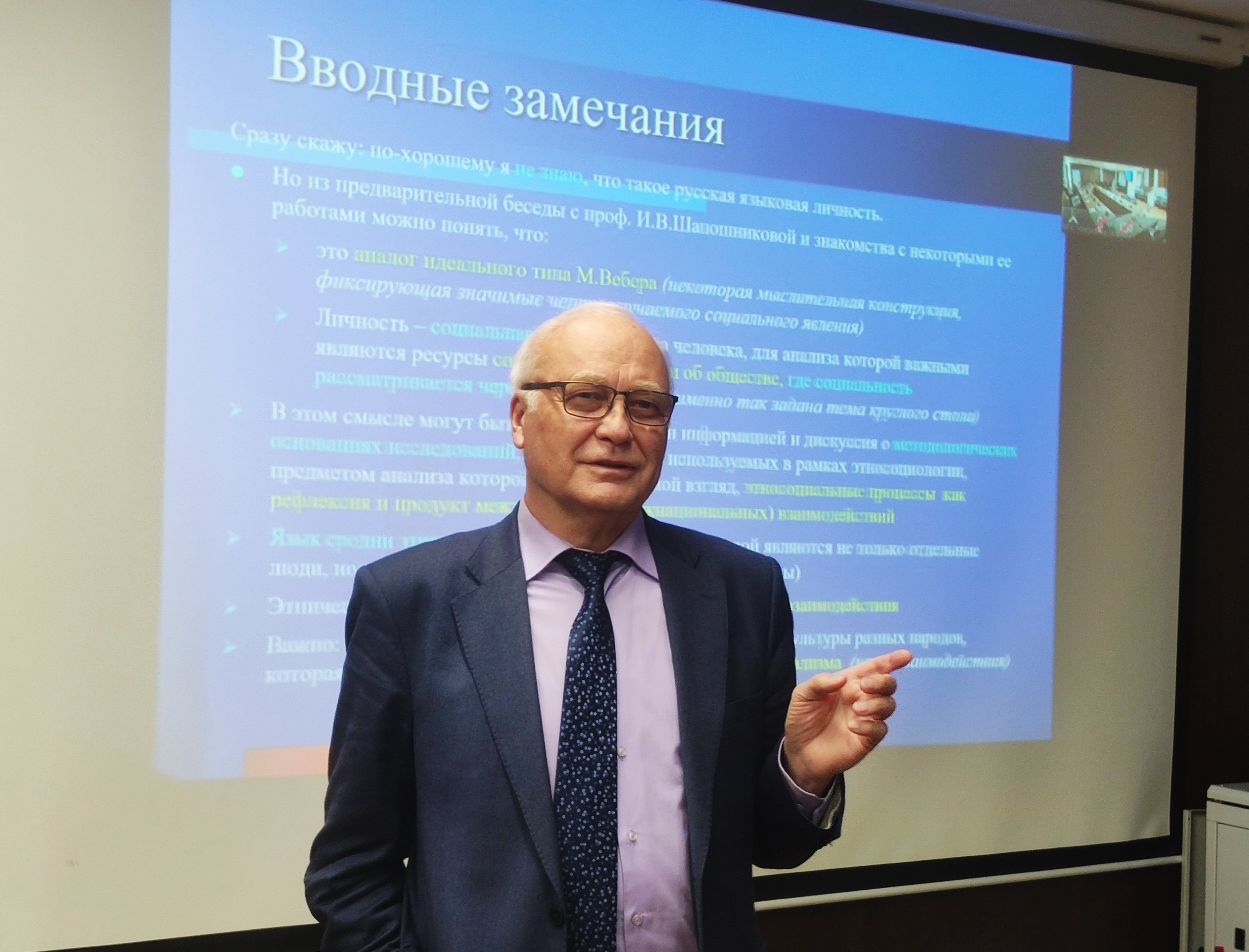 25 октября 2024 года г.н.с. ИФПР СО РАН, профессор Ю.В. Попков выступил с докладом на круглом столе «Русская языковая личность в межнациональном общении», руководителем которого является г.н.с. Института филологии СО РАН, профессор НГУ И.В. Шапошникова. По составу участников и обсуждаемой проблематике он больше соответствует статусу представительной конференции, о чем свидетельствует его насыщенная программа. Основными темами серьезной дискуссии стали: вклад отечественной междисциплинарной науки в изучение вербальной культуры; теоретические подходы и методы изучения языка и типологии русской языковой личности в контексте интегрированного знания о человеке в его разнообразном этнокультурном воплощении; прикладные вопросы диагностики проблем, связанных с межнациональными отношениями, формированием русской языковой личности в различных регионах и социокоммуникативных средах.