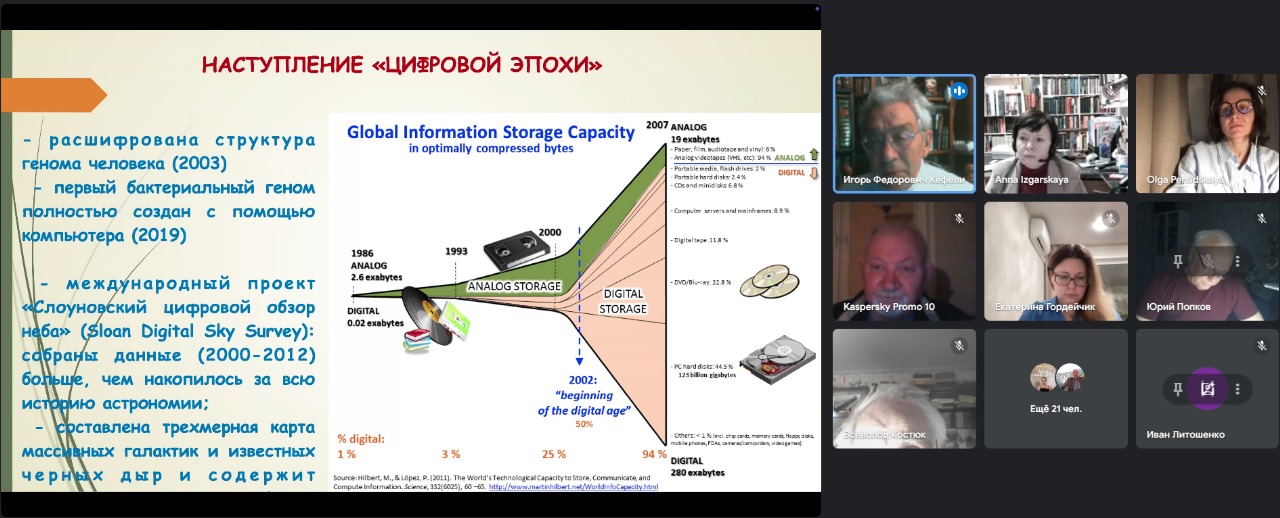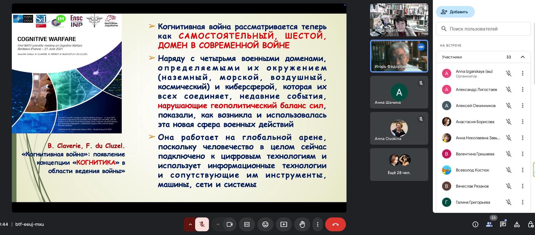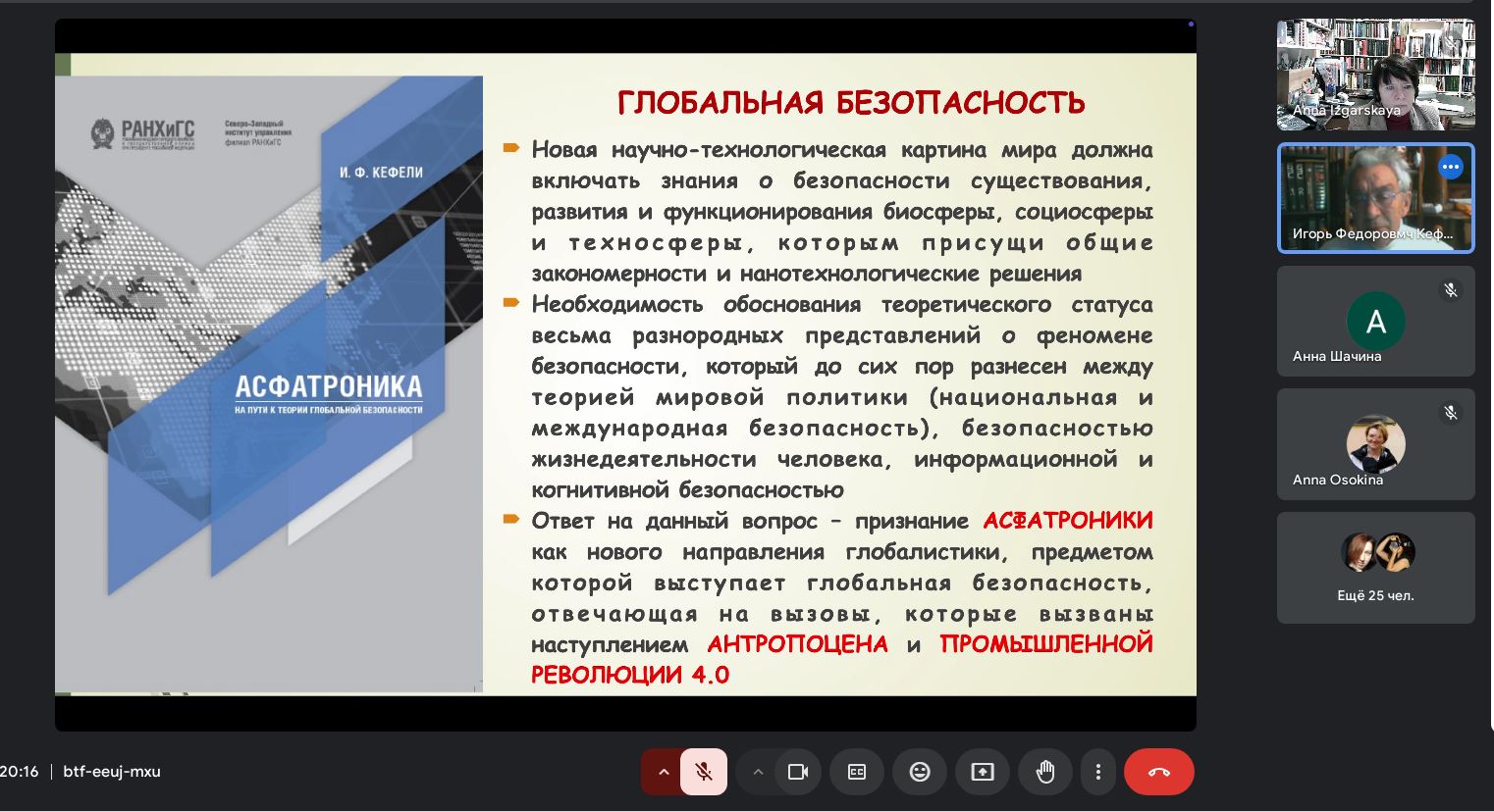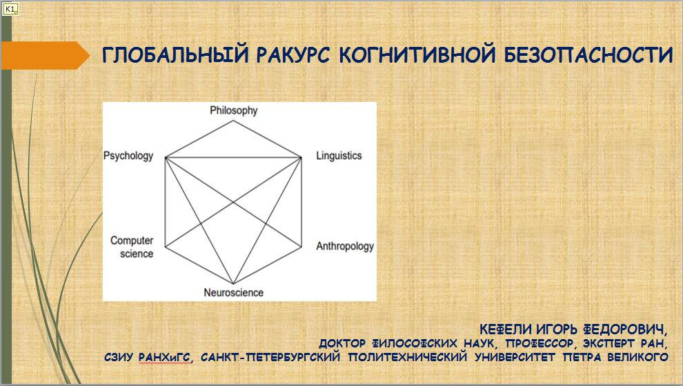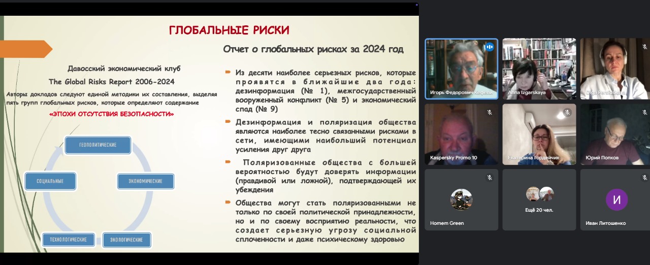 С докладом «Глобальный ракурс когнитивной безопасности» выступил ведущий научный сотрудник лаборатории стратегического планирования и евразийской интеграции Северо-Западного института управления РАНХиГС, заместитель главного редактора журнала «Евразийская интеграция: экономика, право, политика», вице-президент Петровской академии наук и искусств (ПАНИ), руководитель Отделения геополитики ПАНИ, доктор философских наук, профессор Игорь Фёдорович Кефели. За точку отсчета исследования проблем глобальной безопасности и, в частности, когнитивной безопасности докладчик взял серию докладов «The Global Risks Report» Всемирного экономического (Давосского) форума, которые содержат аналитические отчеты по пяти блокам рисков: геополитические; экономические; экологические; технологические; социальные. И.Ф. Кефели обратил внимание присутствующих, что в отчете 2024 года «дезинформация» возглавляет список основных десяти наиболее серьезных рисков, которые, как ожидается, проявятся в ближайшие два года. Острота глобальных проблем, подчеркнул докладчик, требует создания нового направления глобалистики, а именно теории глобальной безопасности, которую он предлагает назвать «асфатроникой». В цифровую эпоху возрастает роль когнитивных наук в осмыслении природы новых опасностей, что ставит перед государством и научным сообществом задачу смены парадигмы обеспечения безопасности и подготовки соответствующих кадров. Разработка концепции когнитивной безопасности востребована, по мнению докладчика, в связи с возникновением и развитием средств ведения когнитивных войн. И.Ф. Кефели под «когнитивной войной» понимает вид войны, которая имеет общевойсковой характер и объединяет боевые возможности кибернетической, информационной, психологической и социальной инженерии с целью одержать победу над противником без физической борьбы. Докладчик продемонстрировал целый ряд зарубежных исследований и показал, что страны НАТО уделяют значительное внимание подготовке к возможным когнитивным войнам. Область когнитивного противостояния рассматривается в зарубежных разработках как рядоположенная наземной, морской, воздушной и космической областям военных действий. В заключительной части доклада И.Ф. Кефели дал оценку ситуации обеспечения когнитивной безопасности в России.