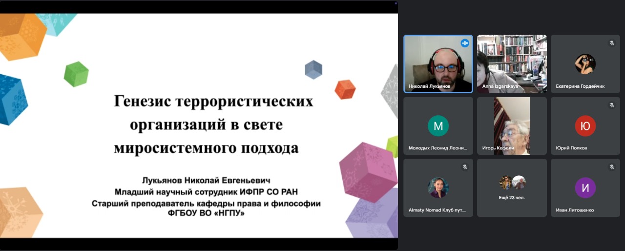С сообщением «Генезис террористических организаций в свете миросистемного подхода» выступил младший научный сотрудник отдела социальных и правовых исследований ИФПР СО РАН, старший преподаватель кафедры права и философии НГПУ, руководитель студенческого ПолитКлуба НГПУ, преподаватель-исследователь Николай Евгеньевич Лукьянов. Докладчик определил терроризм как нелегитимную систему вооруженного насилия, нацеленную на устрашение противника в борьбе за власть. В докладе было показано, как вызревающие в миросистеме противоречия создают предпосылки для генезиса террористических организаций. Был сделан краткий сравнительный анализ онтологических оснований терроризма и моделей формирования террористических организаций в работах представителей инструментального подхода, а именно Т.С. Шеллинга (T.C. Schelling) и А.П. Шмида (A.P. Schmid), и организационного направления М. Креншоу (M. Crenshaw). Докладчик показал, что миросистемный подход способен дополнить их конструкции, так как позволяет описывать порождающую террористическую активность среду через связь с вызреванием противоречий в миросистемне. Используя метод «движение фигура-фон» Т.К. Хопкинса (T. K. Hopkins), докладчик установил связь террористической активности с направлениями движения капитала в миросистеме, с формирующимися на этой основе кумулятивными векторами, а также антисистемными и просистемными формами идеологий. Опираясь на полученные результаты, Н.Е. Лукьянов объяснил различия в активности террористических организаций на постсоветском пространстве.