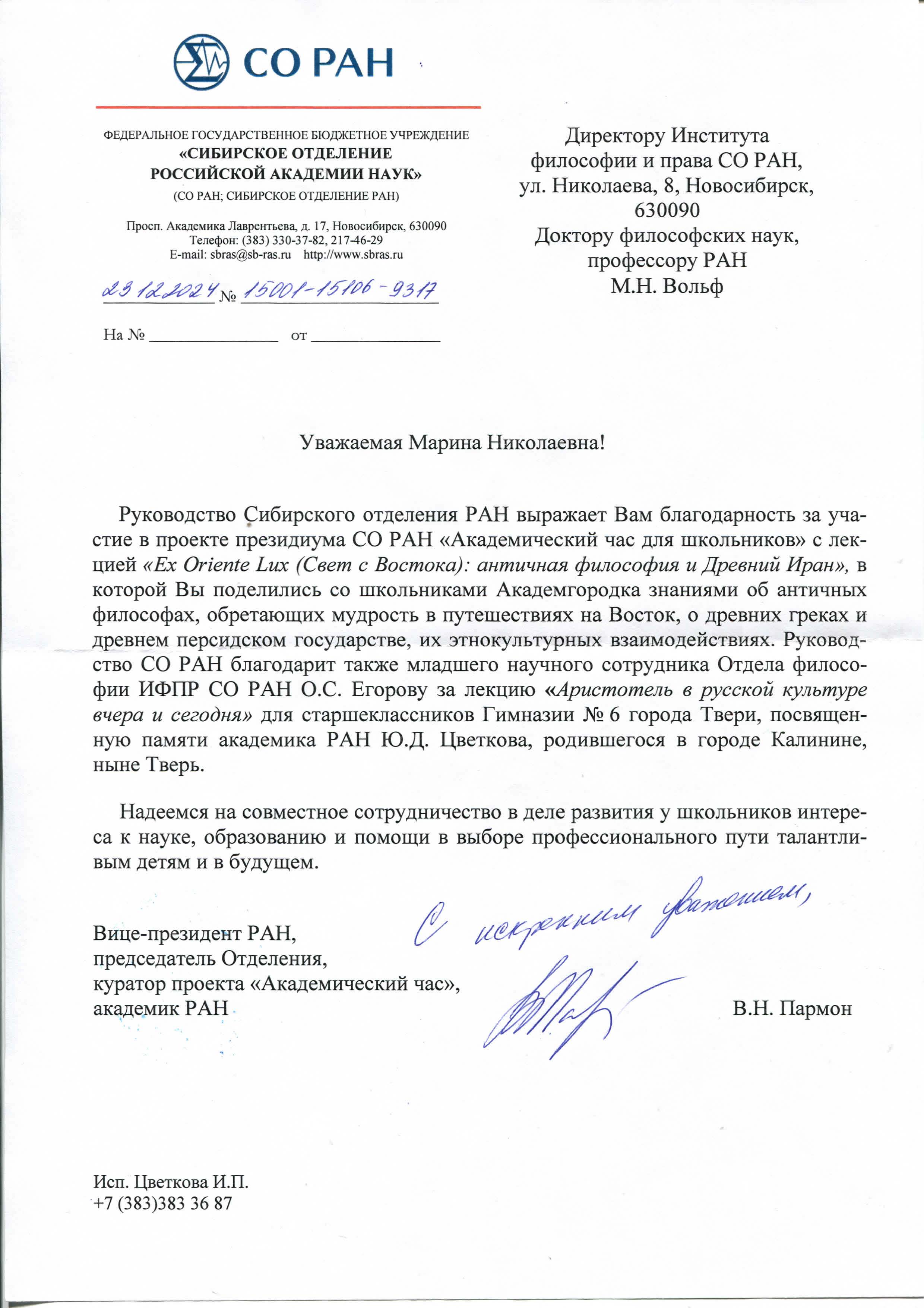 Благодарность Вице-президента РАН, председателя Отделения академика РАН В.Н.Пармона