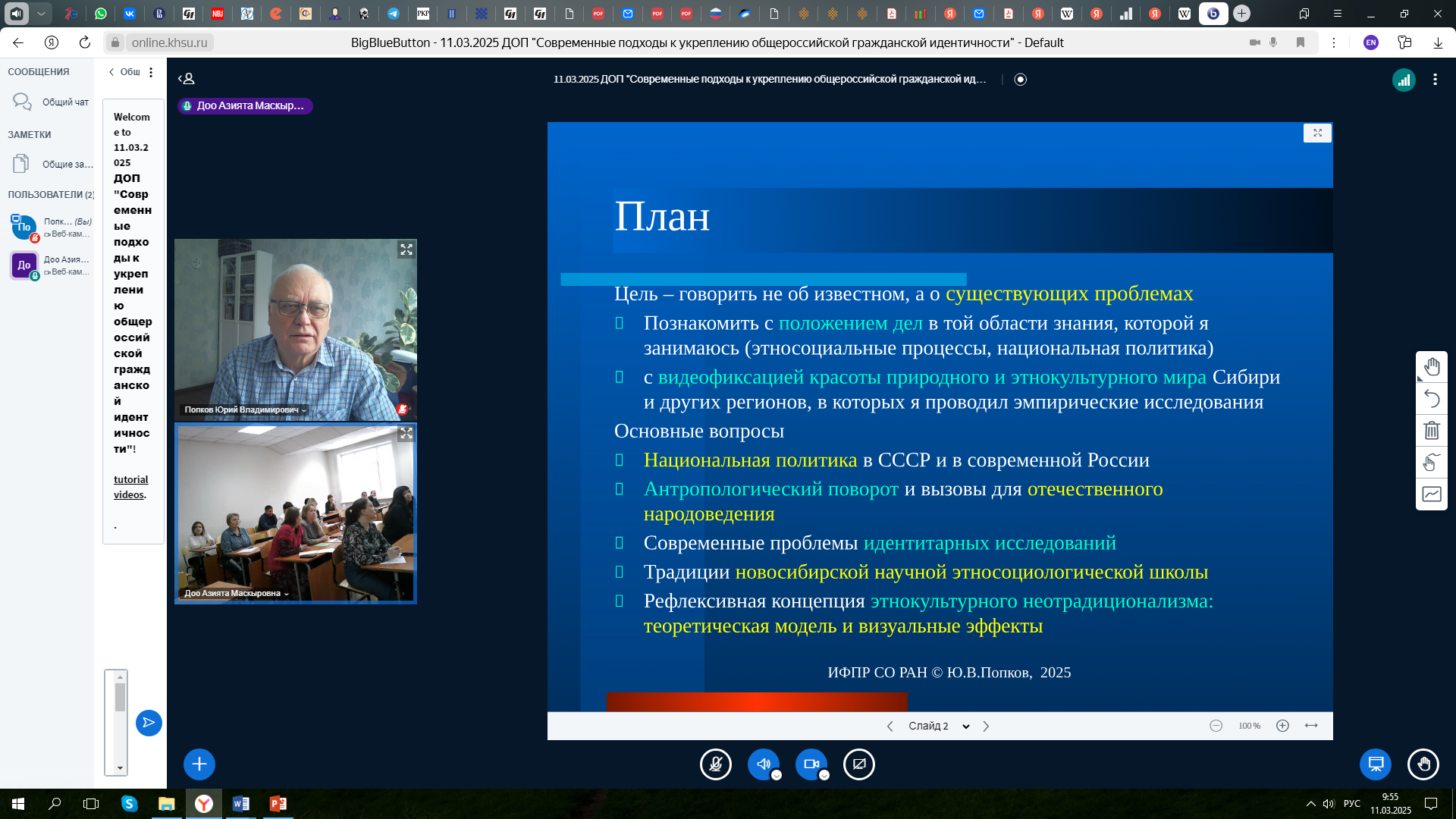 11 марта 2025 года г.н.с. ИФПР СО РАН, профессор Ю.В. Попков выступил перед преподавателями вузов в Хакасском государственном университете с лекцией «Национальная политика и идентичность в традициях отечественного народоведения. Опыт новосибирской научной этносоциологической школы». Лекция организована в рамках образовательной программы «Современные подходы к укреплению общероссийской гражданской идентичности», которая касается повышения квалификации специалистов координационных центров высших учебных заведений по вопросам формирования у молодежи активной гражданской позиции, предупреждения межнациональных и межконфессиональных конфликтов, противодействия идеологии терроризма и профилактики экстремизма; профессорско-преподавательского состава; специалистов по работе с молодежью и воспитательной работе, учебно-вспомогательного персонала образовательных организаций высшего образования.