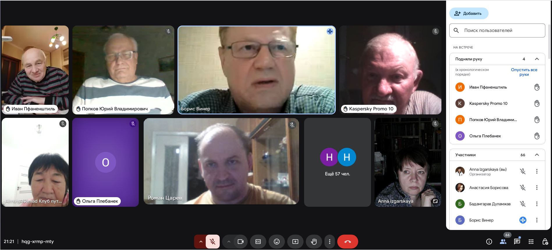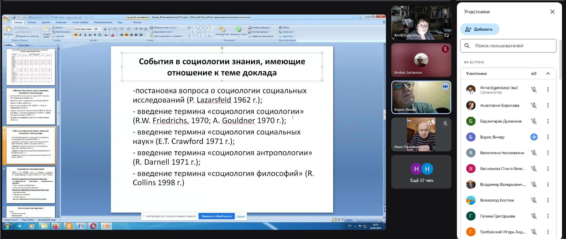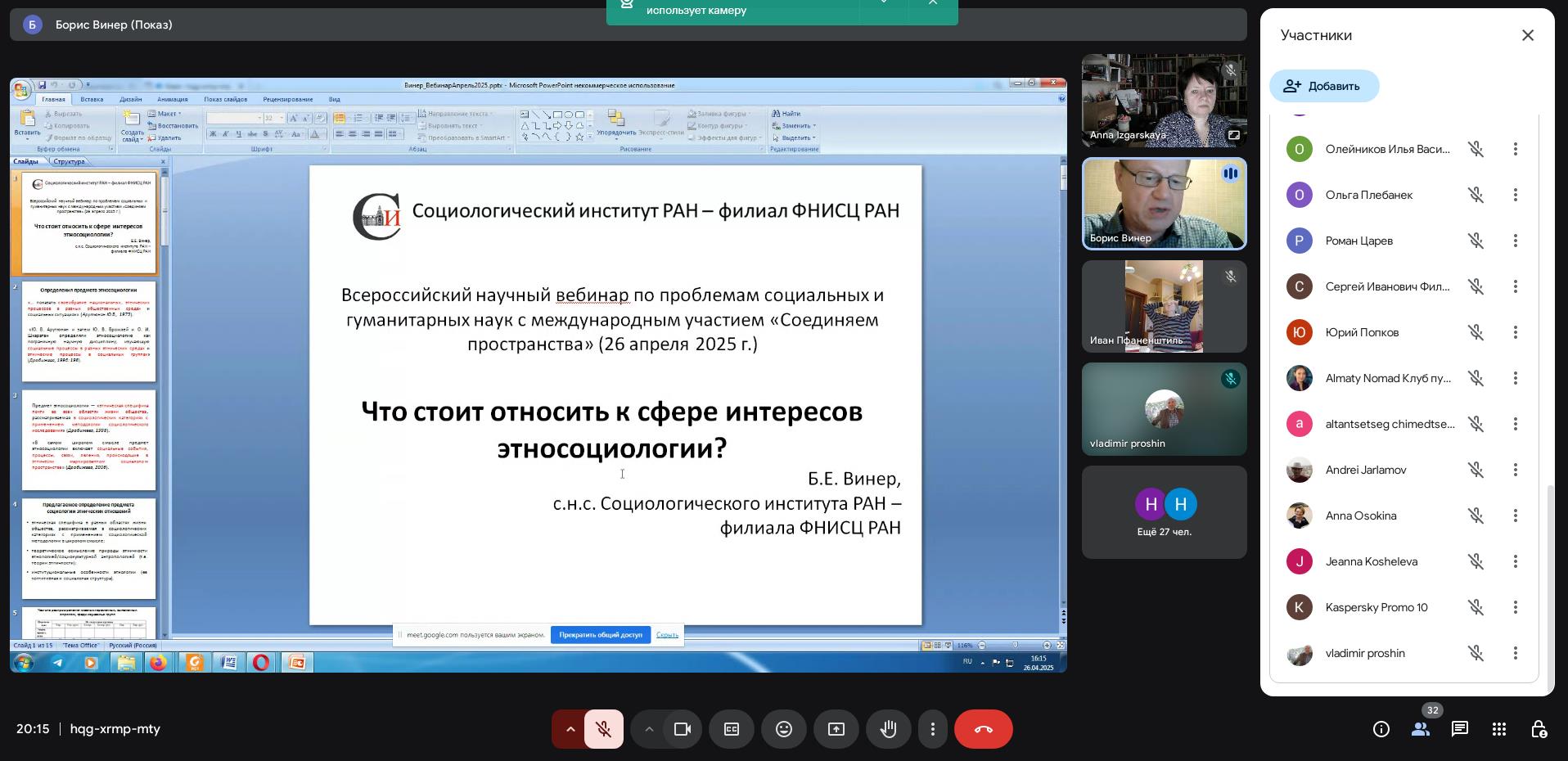 26 апреля состоялось XXIII заседание Всероссийского научного вебинара по проблемам социальных и гуманитарных наук «Соединяем пространства» с международным участием. Старший научный сотрудник сектора истории российской социологии Социологического института РАН филиала Федерального научно-исследовательского социологического центра Российской академии наук (Санкт-Петербург), кандидат социологических наук Борис Ефимович Винер сделал доклад на тему: «Что стоит относить к сфере интересов этносоциологии?». Тема доклада оказалась весьма актуальной, 68 человек из разных городов России (Абакан, Владивосток, Дудинка, Иркутск, Красноярск, Курган, Москва, Новосибирск, Санкт-Петербург, Чита, Якутск), Казахстана (Алматы) и Монголии (Улан-Батор, Баянхонгор, Сухэ-Батор, сомон Мандал) подключились к работе вебинара.