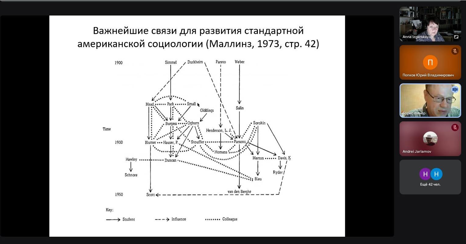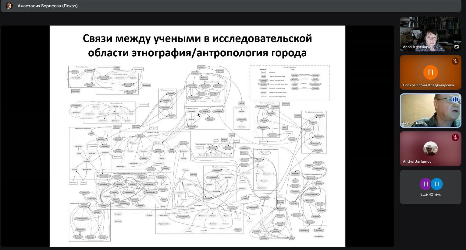 Б.Е. Винер, опираясь на идеи Р. Уитли (R. Whitley) о социальной и когнитивной институционализации научных специальностей и идеально-типическую структуру коммуникации в науке Н. Маллинза (N. Mullins), познакомил участников вебинара с результатами своих исследований связей между отечественными учеными в исследовательской области этнография/антропология города. Более подробно он проиллюстрировал работу метода исследования научных связей на американистах ИЭ АН СССР.