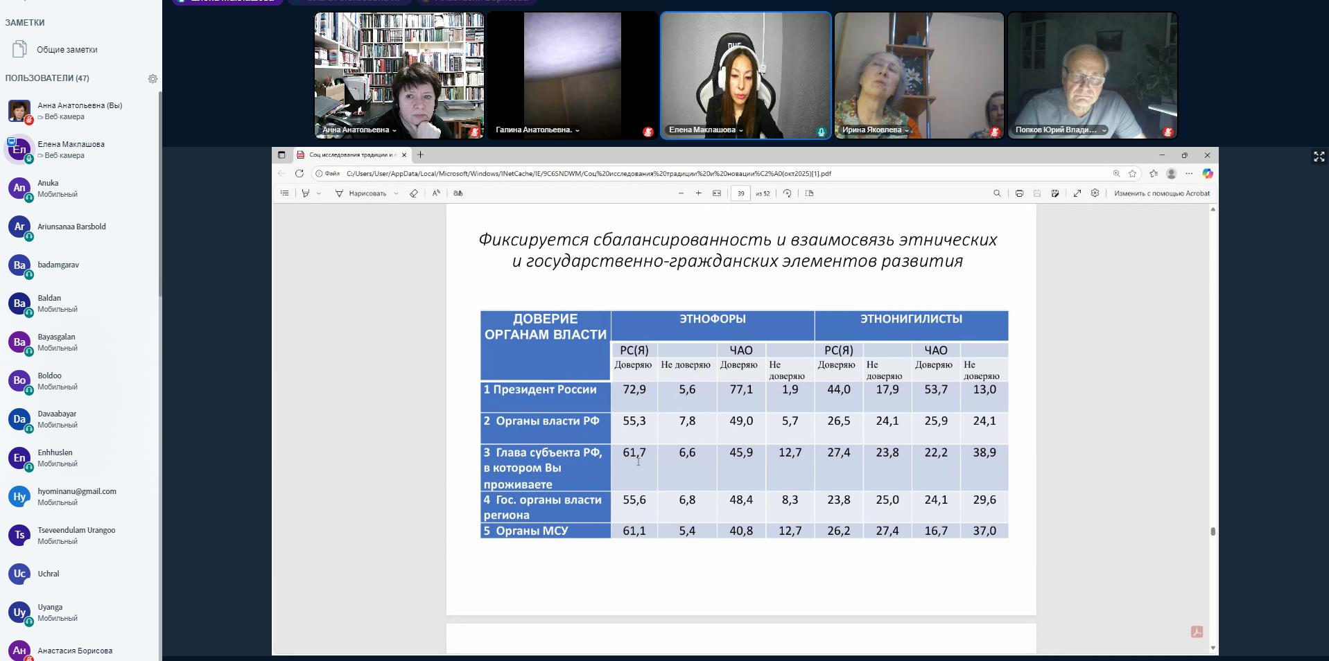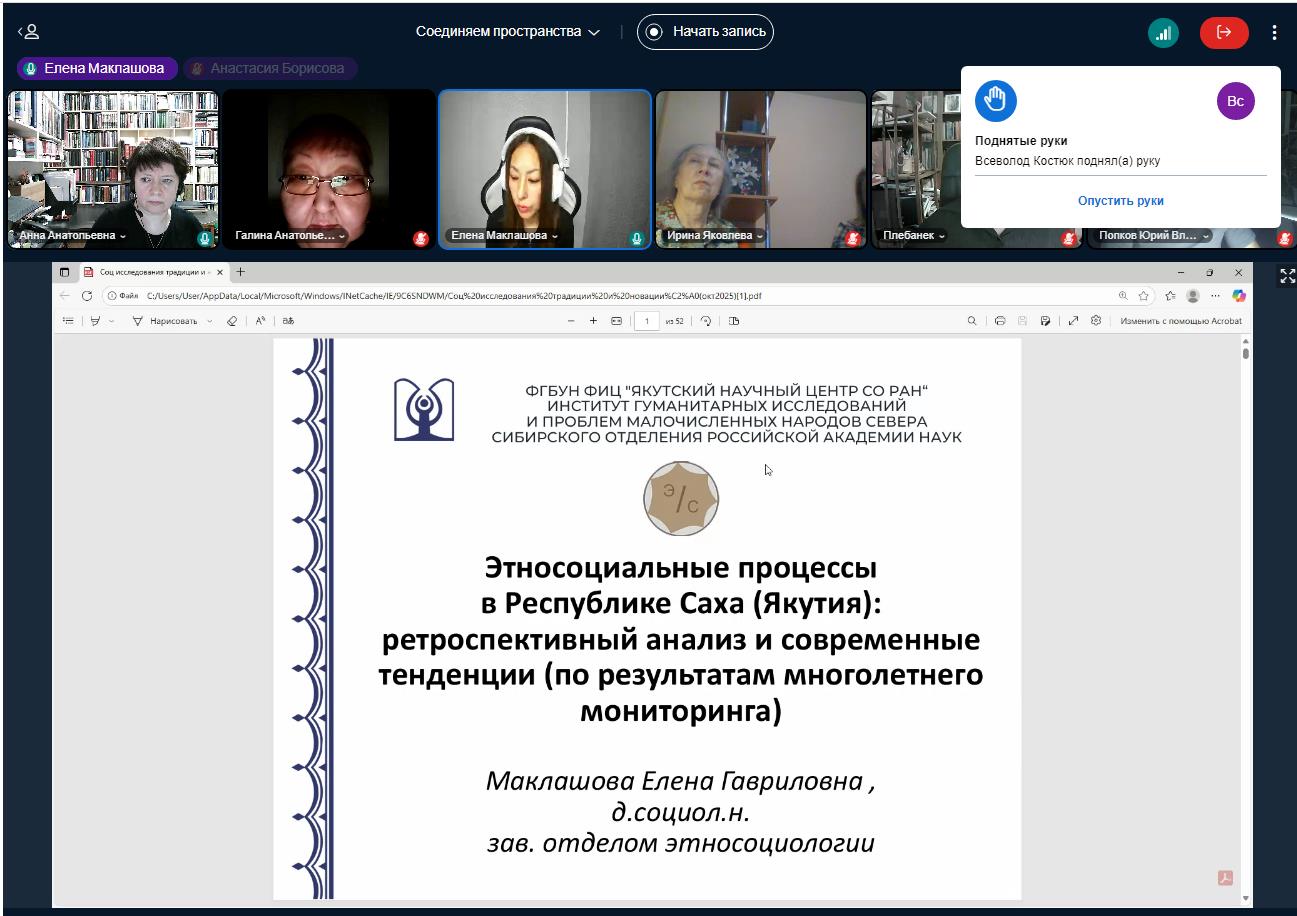 В основной части доклада Е.Г. Маклашова назвала базовые направления деятельности отдела этносоциологии на современном этапе. Она подчеркнула, что теоретико-методологическая концепция социологических и этносоциологических исследований якутских социологов ИГИиПМНС СО РАН базируется на комплексе структурно-функционального (теории социальной стратификации российского общества З.Т. Голенкова/ Т.И. Заславской) и социокультурного (теории согласованных идентичностей, межэтнической солидарности Л.М. Дробижевой, социального настроения Ж.Т. Тощенко) подходов, полипарадигмальном подходе к изучению этнической идентичности Л.М. Дробижевой. Е.Г. Маклашова раскрыла региональную специфику социологических и этносоциологических исследований, описала содержание проведенных в 2013–2014 гг., 2021–2022 гг. и 2024–2025 гг. массовых опросов населения, представила четыре ключевых кейса проведенных работ. Первый кейс был посвящен лонгитюдному исследованию социального самочувствия населения республики Саха (Якутия) (2011–2026 гг.). Во втором кейсе были представлены результаты мониторинга этнической идентичности населения Якутии и Чукотки (2023–2025 гг.). Третий кейс раскрыл результаты мониторинга межнациональных отношений в Якутии. В четвертом кейсе были представлены результаты исследований культурной открытости и границ согласия.