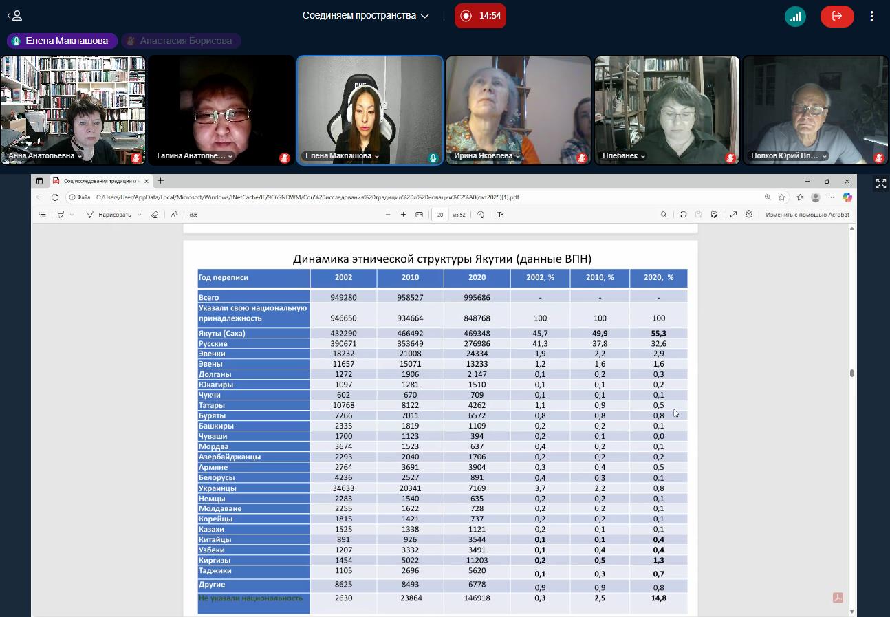 Главный научный сотрудник, заведующий отделом этносоциологии Института гуманитарных исследований и проблем малочисленных народов Севера СО РАН, кандидат политических наук, доктор социологических наук Елена Гавриловна Маклашова сделала доклад на тему: «Этносоциальные процессы в Республике Саха (Якутия): ретроспективный анализ и современные тенденции (по результатам многолетнего мониторинга)».