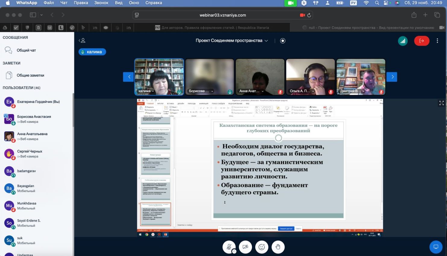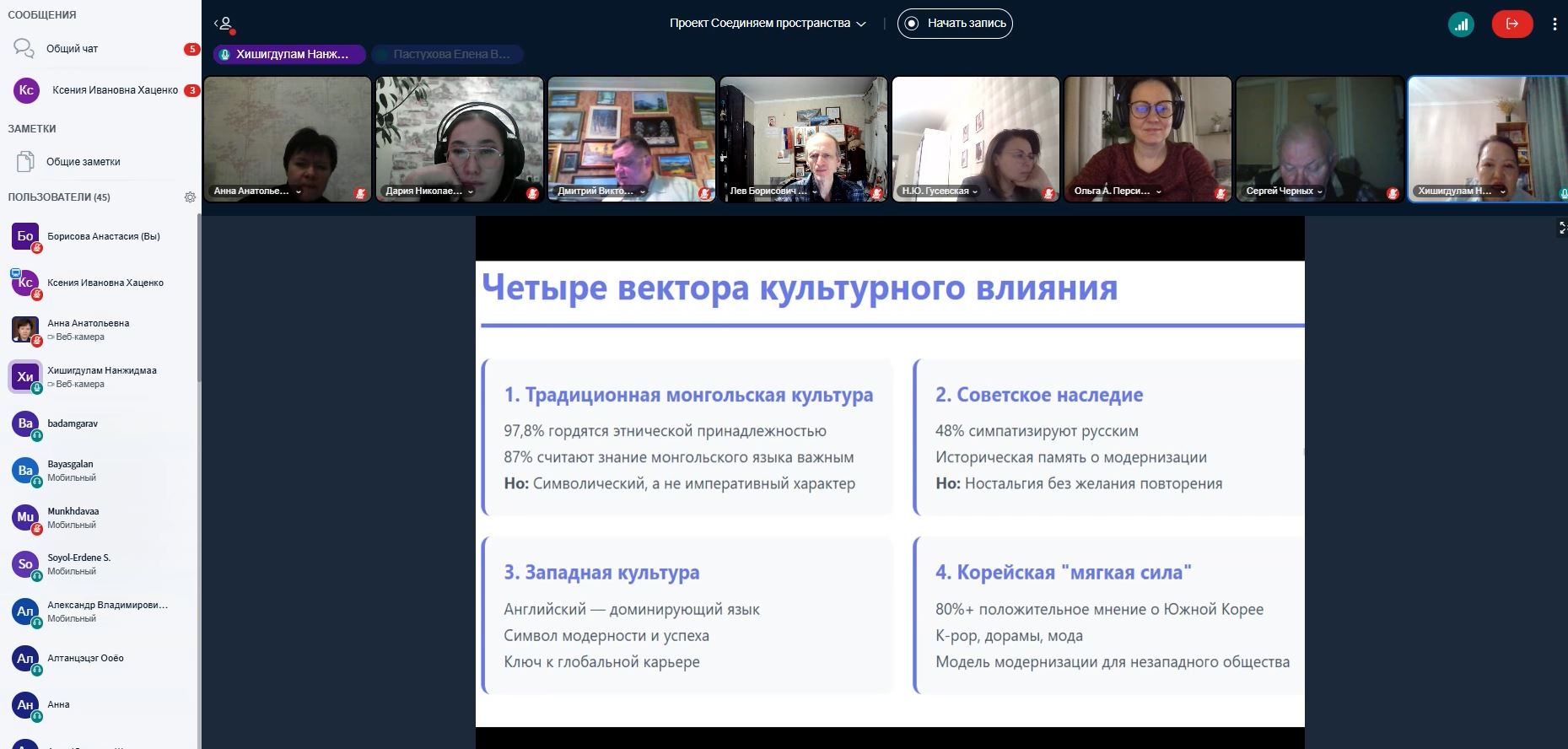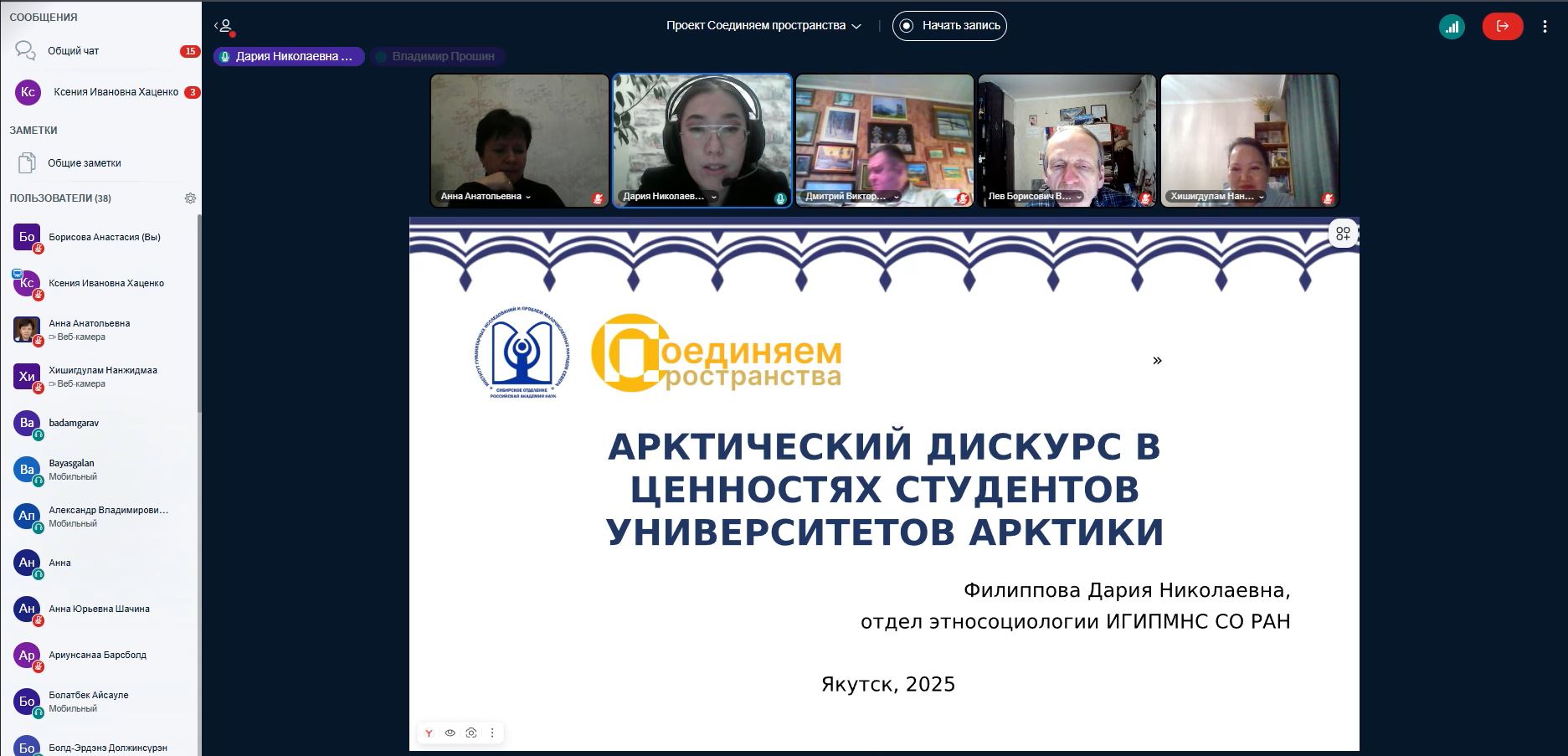 29 ноября 2025 г. состоялось XXVI заседание Всероссийского с международным участием научного вебинара по проблемам социальных и гуманитарных наук «Соединяем пространства». Вебинар был подготовлен совместно с НИИ Философия образования Новосибирского государственного педагогического университета (НГПУ). В работе вебинара приняли участие 52 человека из разных городов России (Владивосток, Дудинка, Красноярск, Москва, Мурманск, Новосибирск, Омск, Санкт-Петербург, Томск, Чита, Якутск), Казахстана (Алматы) и Монголии (Улан-Батор). Участники заслушали и обсудили три доклада.