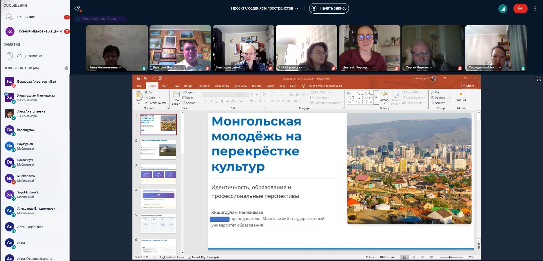 Основное противоречие складывающейся гибридной идентичности докладчик видит между коллективистскими культурными ценностями, которые присущи монгольской молодежи, и индивидуализмом как принципом господствующей капиталистической экономики. Текущее состояние Н. Хишигдулам описала, используя наработки российских ученых (Ю. В. Попкова, Е.А. Тюгашева, Д. В. Ушакова), как «цивилизационную паузу». Н. Хишигдулам отметила, что 98% молодых людей считает образование важнейшей ценностью, однако в сложившихся условиях существует ряд проблем, которые не позволяют полноценно использовать потенциал молодежи в целях экономического развития страны. Опираясь на статистические данные Н. Хишигдулам показала, что наличие высшего образования не гарантирует занятости и достойной зарплаты. В 2017 году был принят Закон «О развитии молодёжи», был профинансирован целый ряд направлений поддержки молодежи, но уровень безработицы среди молодежи не изменился. Сохраняется дисбаланс образования и рынка. В результате образовательная миграция, главным образом в Южную Корею, США, Японию, Чехию, Швецию, становится неформальной системой социальной защиты и часто превращается в эмиграцию. В соответствии с Президентской программой «Илгээлт 2100», направленной на систематическую отправку студентов в ведущие зарубежные университеты, в 2025-2026 учебном году запланирована отправка 39 студентов в Германию, 8 – во Францию, продолжается набор в университеты Киргизии, Хорватии, Лаоса. Приоритетными специальностями являются сельское хозяйство, гуманитарные науки, экономика. Н. Хишигдулам подчеркнула противоречия данной программы, выразила опасения, что программа будет способствовать росту образовательной эмиграции и потере Монголии самого ценного ресурса развития – молодежи. Н. Хишигдулам обозначила направления и средства решения назревших проблем.