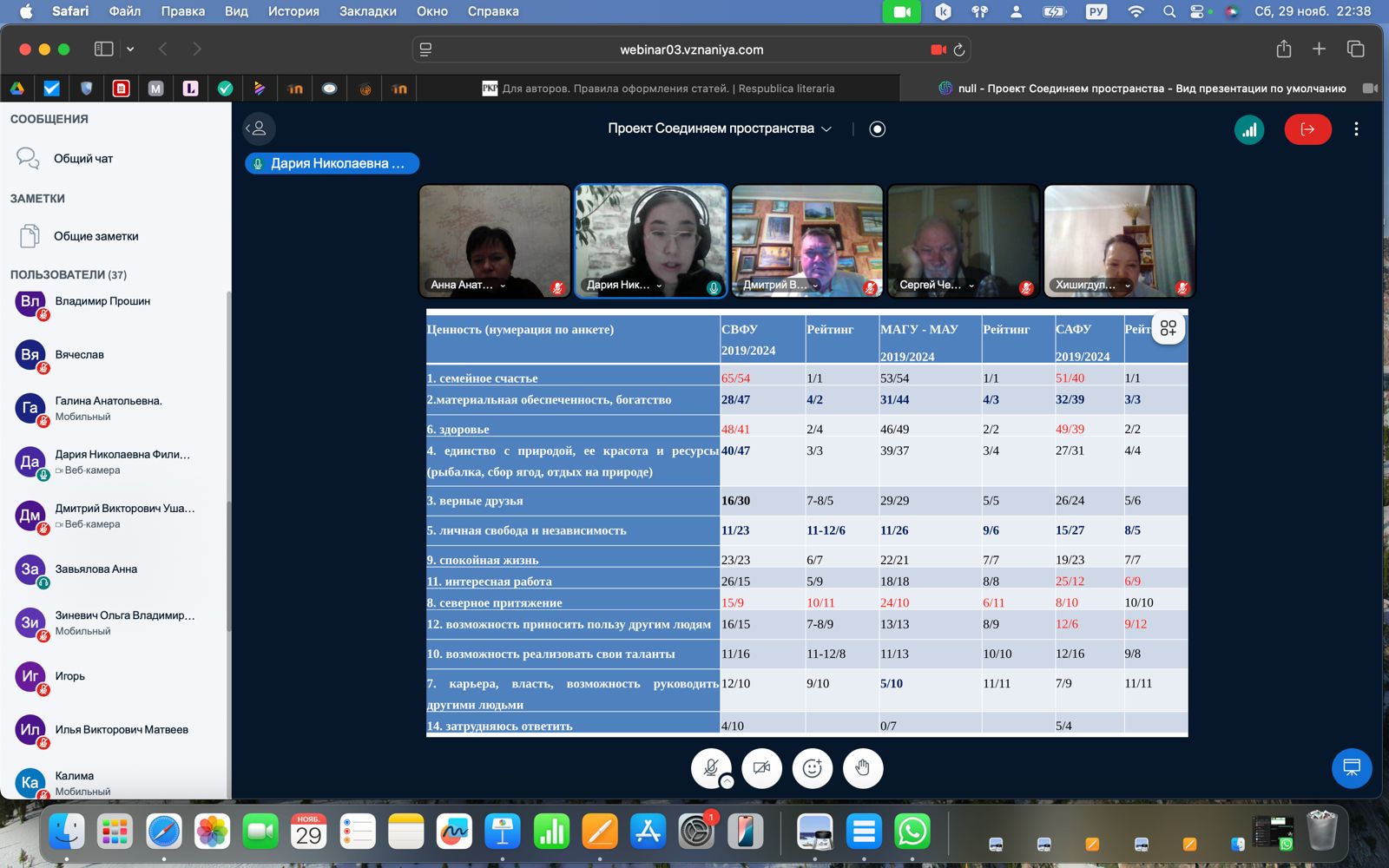 Участники вебинара получили возможность познакомиться с ответами студентов арктических университетов на целый ряд вопросов, а именно: «Хотели бы Вы постоянно работать в условиях Арктики?»; «Намерены ли Вы остаться в Арктике сразу после окончания учебы?»; «Участвуете ли Вы в реализации международных, российских, региональных, вузовских проектов, связанных с Арктикой?»; «По Вашему представлению, что есть Арктика?»; «Кем Вы себя считаете по территориальной принадлежности?»; «Как Вы себе представляете жизнь в Арктике по сравнению с другими территориями?». Д.Н. Филиппова проинтерпретировала результаты проведенных опросов. Исследование динамики ценностей 2019–2024 гг. показало, что повысили позиции такие ценности, как «материальная обеспеченность», «личная свобода и независимость», «семейное счастье», «здоровье», «верные друзья», «единение с природой, ее красота».