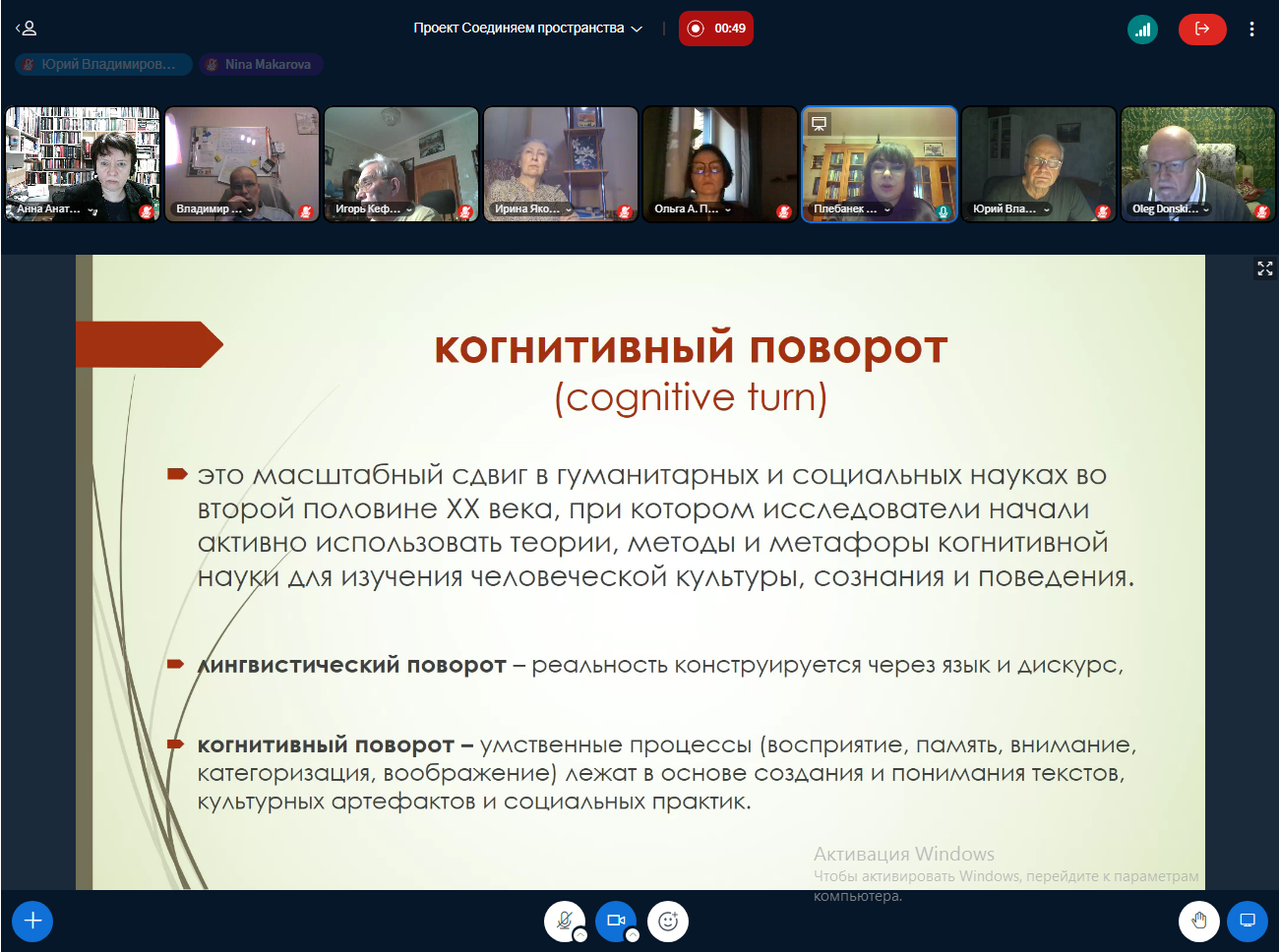 В первой части доклада О.В. Плебанек описала предметное поле своего исследования. Она раскрыла суть когнитивного поворота, произошедшего во второй половине XX века, пояснила его особенности через сравнение с лингвистическим поворотом. О.В. Плебанек подчеркнула, что когнитивные процессы (восприятие, память, внимание, категоризация, воображение) лежат в основе создания и понимания текстов, культурных артефактов и социальных практик, поэтому нам необходимо понимать, с одной стороны, как мы воспринимаем этот мир, а с другой стороны, как мы его создаем в соответствии с принципом ингрессии (в терминах А.А. Богданова). Подготавливая аудиторию к основной части доклада О.В. Плебанек выделила и описала несколько ключевых идей когнитивного поворота. В рамках когнитивного подхода человек понимается как перерабатывающий информацию организм. Когнитивный подход делает акцент на поиск общих, биологически обусловленных механизмов мышления, стоящих за культурным разнообразием. Он опирается на эмпиризм и междисциплинарность, для проверки гуманитарных гипотез заимствует методы и данные из нейронауки, психологии, эволюционной биологии, теории искусственного интеллекта. О.В. Плебанек указала, что в основе когнитивного подхода используется концепция воплощенного сознания (Ф. Варела, Э.Рош), утверждающая, что наше мышление формируется сенсомоторным опытом, и концепция распределенного сознания (Э. Хатчинс). Далее О.В. Плебанек обозначила ключевые концепции, на основе которых произошло становление когнитивной программы социогуманитарного знания. Таковыми, по мнению О.В. Плебанек, являются культурно-историческая концепция развития психики человека Л.С. Выготского, общая теория систем Л. фон Берталанфи, разработанная У. Матураной и Ф. Варелой в 1970-х годах концепция автопоэзиса, концепция биокультурной эволюции Э. Уилсона и Ч. Ламсдена, концепция культурогенеза Р. Докинза.