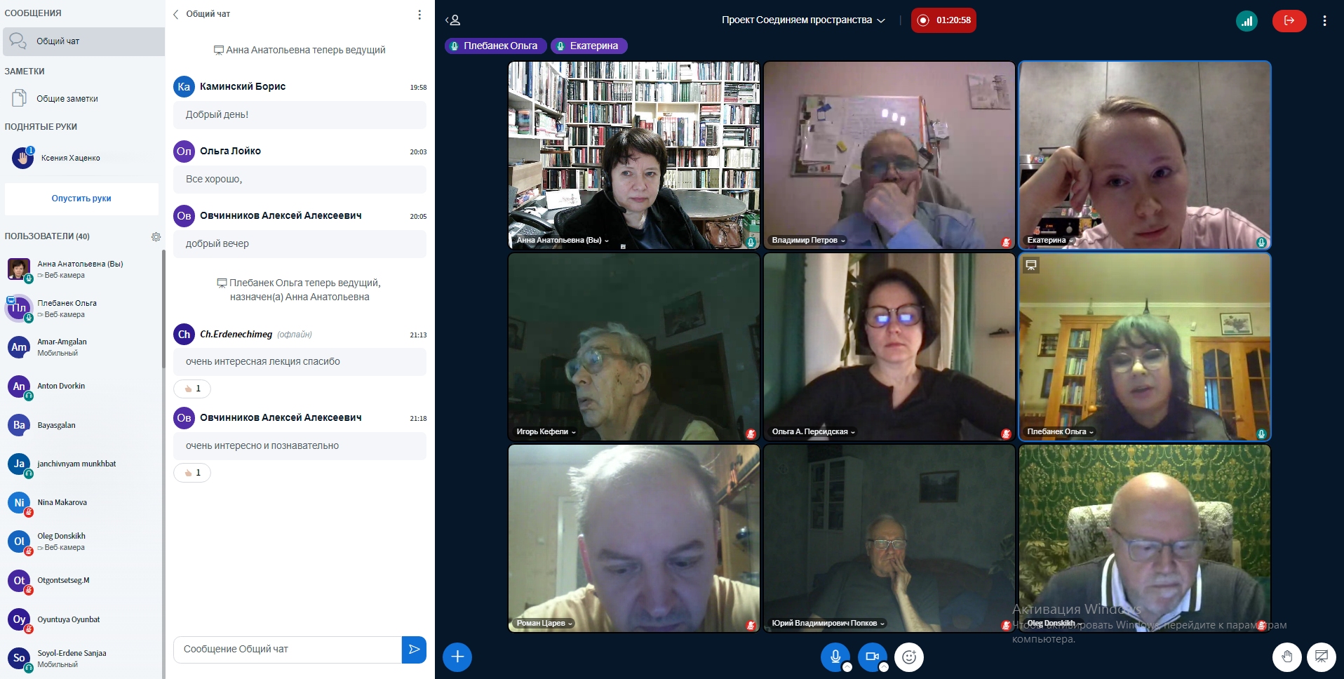 28 марта состоялось XXX заседание Всероссийского с международным участием научного вебинара по проблемам социальных и гуманитарных наук «Соединяем пространства». Вебинар был подготовлен совместно с кафедрой социально-гуманитарных дисциплин Университета при Межпарламентской Ассамблее Евразийского экономического сообщества (МПА ЕврАзЭС) (г. Санкт-Петербург). В работе приняли участие 39 исследователей из разных городов России (Абакан, Иркутск, Курган, Купино, Москва, Мурманск, Новосибирск, Санкт-Петербург, Томск), Казахстана (Алматы) и Монголии (Улан-Батор, Булган, Баянхонгор, Хэнтий, Баян-Ульги).