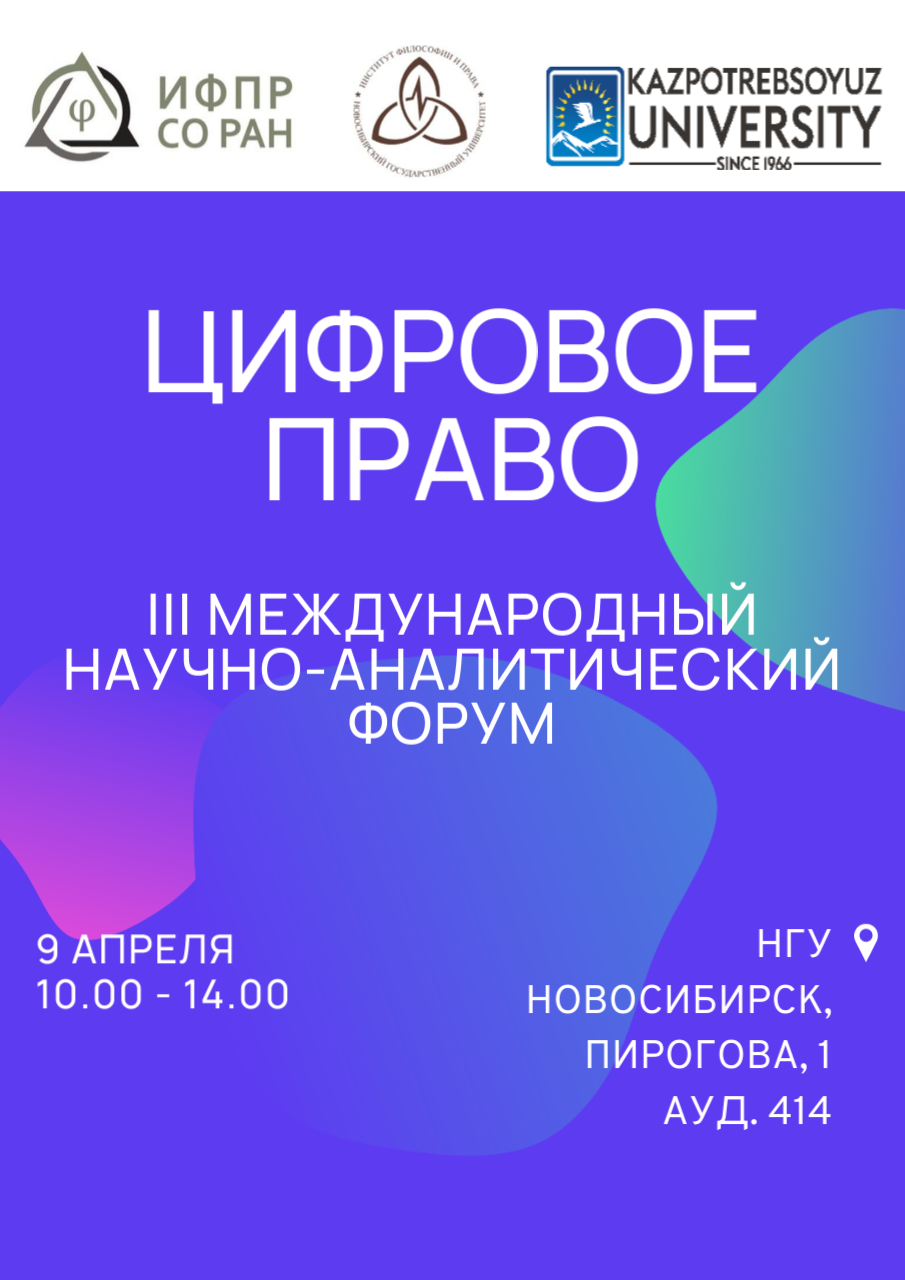 Приглашаем Вас принять участие в работе III Международного научно-аналитического форума «Цифровое право» и выступить с докладом очно или онлайн. Мероприятие проводится Институтом философии и права Сибирского отделения Российской академии наук и Институтом философии и права Новосибирского государственного университета совместно с кафедрой «Правовое регулирование экономических отношений» Карагандинского университета Казпотребсоюза (г. Караганда, Республика Казахстан).