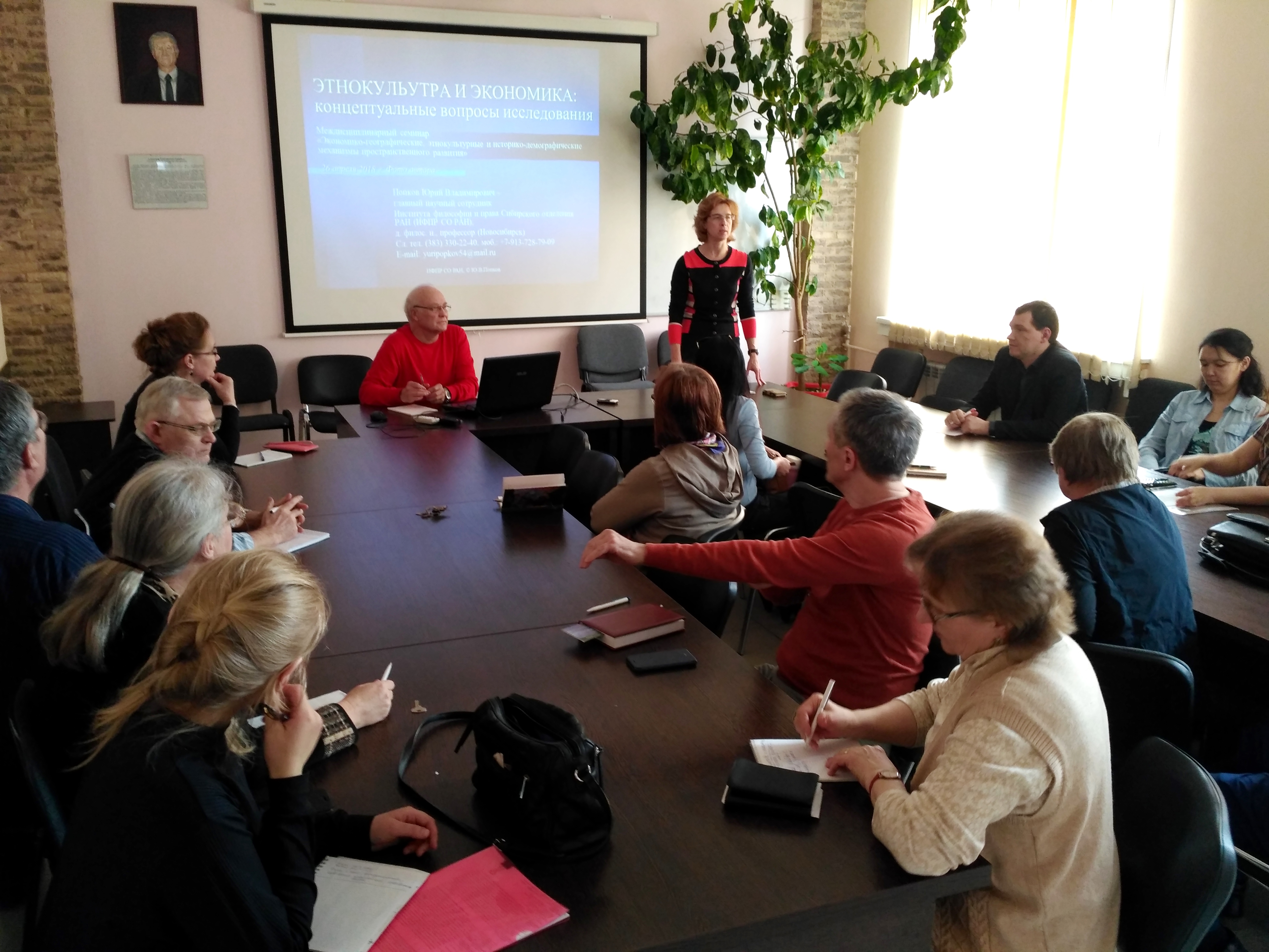К настоящему времени состоялось уже пять заседаний междисциплинарного семинара. Первый доклад «Историко-демографические, этнокультурные и экономические факторы пространственного развития Сибири» сделала Е.А.Коломак. Доклад был посвящен актуализации темы, как она видится специалистам-экономистам, с обзором существующих наработок в данной области, а также обсуждению узловых вопросов сотрудничества участников проекта. Содержание второго доклада ее автор д.филос.н. Е.А.Ерохина достаточно точно отразила в названии «Доминирующее большинство и недоминантное меньшинство между государственным патернализмом и рынком: возможности и пределы институтов воспроизводства этничности». Третий доклад В.А.Исупов посвятил основным историческим тенденциям формирования демографического пространства Сибири (конец XIX – XX вв.) на основе данных статистического учета. Следующий доклад был подготовлен тремя сотрудниками ИЭОПП СО РАН – Е.А.Коломак, к.э.н. А.Н.Буфетовой и аспирантом А.А.Хржановской и касался методических вопросов и результатов оценки (с использованием разных индексов) этнонационального и религиозного разнообразия в регионах Сибири. Наконец, в своем докладе в конце апреля 2018 г. Ю.В.Попков остановился на конпептуальных вопросах исследования взаимосвязи этнокультуры и экономики, этнокультурного и экономического развития.