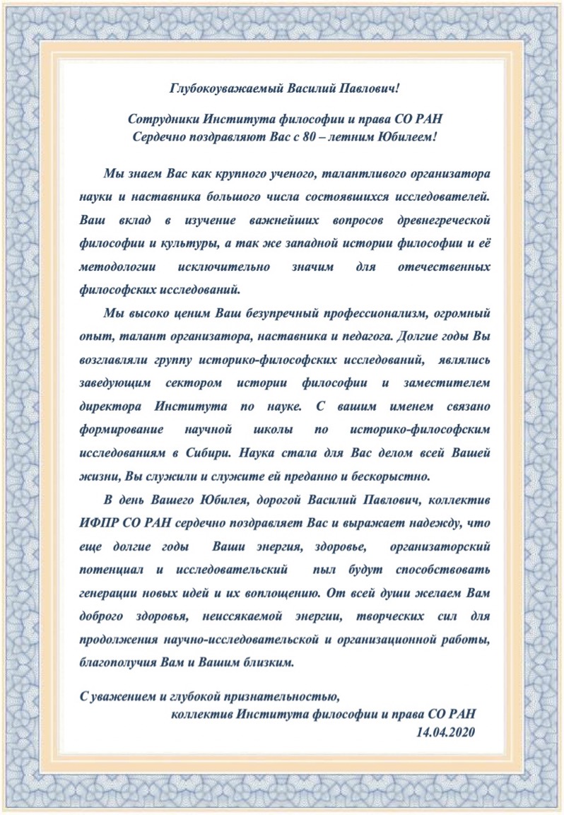 Поздравляем с Юбилеем! Главному научному сотруднику, д.филос.н., профессору Горану Василию Павловичу — 80 лет!