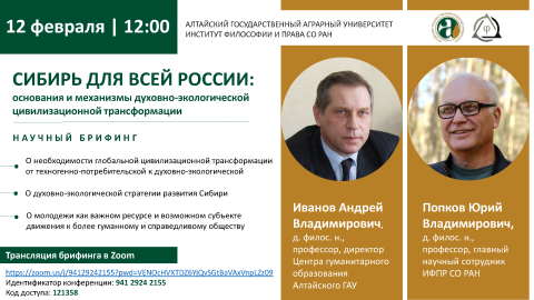 Недавно мы сообщали о научном брифинге по итогам исследования «Сибирь для всей России: основания и механизмы духовно-экологической цивилизационной трансформации». Спикерами на нем выступили директор Центра гуманитарного образования АГАУ, профессор А.В. Иванов и г.н.с. ИФПР СО РАН, профессор Ю.В.Попков. В дискуссии принимал участие также с.н.с. ИФПР СО РАН В.Г.Костюк.