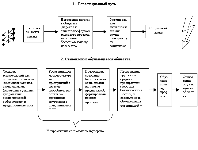 В этом контексте все более осознается необходимость перехода от кризисного к обучающемуся обществу. В современных условиях этот переход является более естественным и гуманным, чем движение к революционному обществу, состоянию, которое уже дважды охватывало Россию в XX столетии.