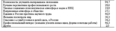 побудительной структуре к миграции другие мотивы могут занимать в общем и целом лишь вторичное или производное положение.Если говорить о структуре мотивов побуждающих ученых ННЦ к выезду на контрактную работу за рубежом, то она обладает своей спецификой, очевидно детерминированной как кризисными особенностями непосредственного эмпирического существования научного сообщества, так и кризисными характеристиками более широкого социального контекста.