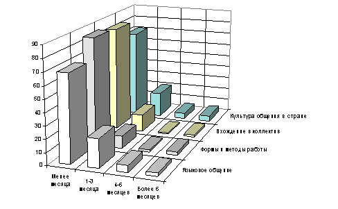 Время адаптации ученых ННЦ к условиям жизни и работы за рубежомДанные показывают, что почти все ученые достаточно быстро – фактически в течение месяца – сумели адаптироваться к чужой языковой и культурной среде, а также к принятым за рубежом формам и методам работы и включиться в творческий коллектив. В связи с этим интересны другие результаты проведенного исследования, согласно которым ученые по истечении уже многих лет так называемого реформирования общества и имитации реформирования науки признают свою недостаточную приспособленность к жизни и работе в новых социально-экономических условиях. Так, хорошо адаптированными к ним чувствуют себя всего 6%, с трудом приспосабливаются к новой жизни 30%, более половины чувствуют, что приспосабливаются более или менее