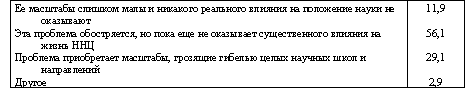 В принципе отношение ученых ННЦ к выезду на контрактную работу за рубеж нормальное. Они рассматривают данный процесс как вполне естественный и отнюдь не бесполезный. В частности фиксируется позитивный эффект как для развития отечественной науки, так и , что немаловажно в современных кризисных условиях жизни, для отдельных ученых, в том числе и в материальном аспекте. Вместе с тем оценка международной миграции далеко не однозначна и ее негативная тональность определенно нарастает при фокусировке внимания на ряде сопровождающих миграцию явлений и процессов. Сюда относят “утечку” оригинальных идей и информации, иногда являющихся продуктом работы целого коллектива; продление, нередко значительное, сроков пребывания за рубежом; ослабление потенциала научных школ вследствие отъезда их лидеров либо значительной части сотрудников и, наконец, невозвращение в Россию. Разумеется, каждый из этих моментов, если он не достиг критического порога, но проявляется лишь как тенденция, сам по себе не выглядит чрезвычайным. Но все вместе в течение определенного времени они способны вызвать кумулятивный эффект. Его негативное значение отчетливо не проявляется в поле частных или личных интересов, но через призму перспектив развития отечественной науки и российского общества это значение тотчас высвечивается и определяет соответствующую оценку. Так “утечка умов” и идей за рубеж определенно расценивается респондентами как одна из негативных тенденций, проявляющихся ныне в ННЦ. По своей значимости она занимает четвертое место среди 8-9 такого рода тенденций и привлекает в качестве именно негативного явления внимание почти половины ученых (48%).