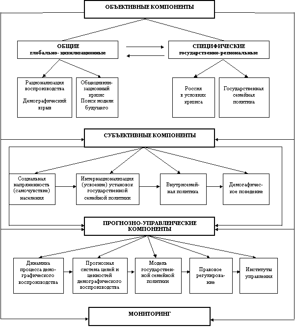 Расхожее мнение, что семья сама принимает решение какой быть ее демографической политике транслируется и в государственную семейную политику. Но специфические функции семьи не есть только «ее забота» – это забота прежде всего общества, государства. Взаимодействие и взаимосвязь с социальными институтами общества, более широкими социальными процессами развития, реформами, модернизациями и т.п. во многом определяют и обусловливают внутрисемейную политику и деятельность, в том числе и личностную установку на демографическое поведение, на характер социализации личности ребенка. Функция социализации, воспитания детей, формирования личности выполняется и семьей, и обществом. Государство не только определяет прямые (не через семью) ресурсы на формирование личности (школа, медицина, спорт), но и «заказывает» семье эталон личности, гарантирует семье необходимые ресурсы, которые она «делит» между содержанием ребенка и удовлетворением своих личных потребностей. Государственная семейная политика определяет демографическое поведение семьи и другими разнообразными средствами. Таким образом, субъективные установки, демографическое поведение семьи социально обусловлены. Влияние этой обусловленности и становится принципиальным в исследованиях семьи. Прежде всего, необходимо определить характер социального влияния на выполнение семьей демографической функции в соответствии с целями будущего общества. В предлагаемой схеме (схема 1) рассматривается методология исследования взаимодействия и взаимосвязи компонентов, определяющих демографическое поведение семьи. В данной статье рассмотрим влияние лишь объективных условий и прежде всего – специфических, т.е. оказывающих непосредственное влияние на внутрисемейную политику. Что касается общих объективных условий, оказывающих влияние опосредованно, то фрагментарно обозначим только два фактора, но, на наш взгляд, более глобальных: общецивилизационный процесс рационализации демографического воспроизводства и глобальный кризис цивилизации на пороге XXI века.